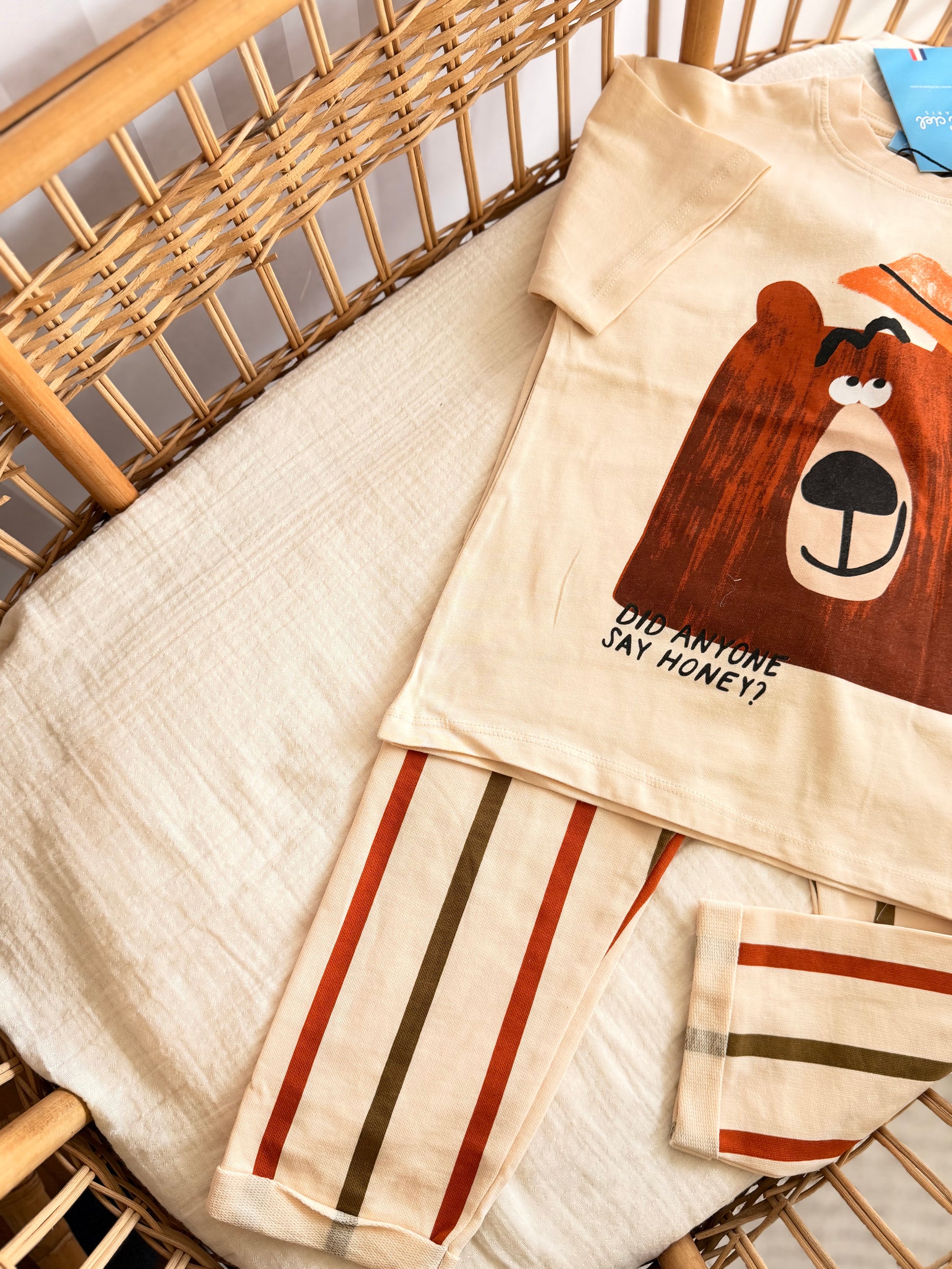 Introduce your kids to cozy comfort with this adorable 2-piece bear set! Featuring a charming bear design paired with striped sweat trousers, this playful ensemble combines style with softness. The unique design makes it perfect for playdates, casual outings, or snuggle time at home. Crafted for all-day wear, these pieces work beautifully together or mix-and-match with other favorites in their wardrobe. A must-have addition to any child's collection!