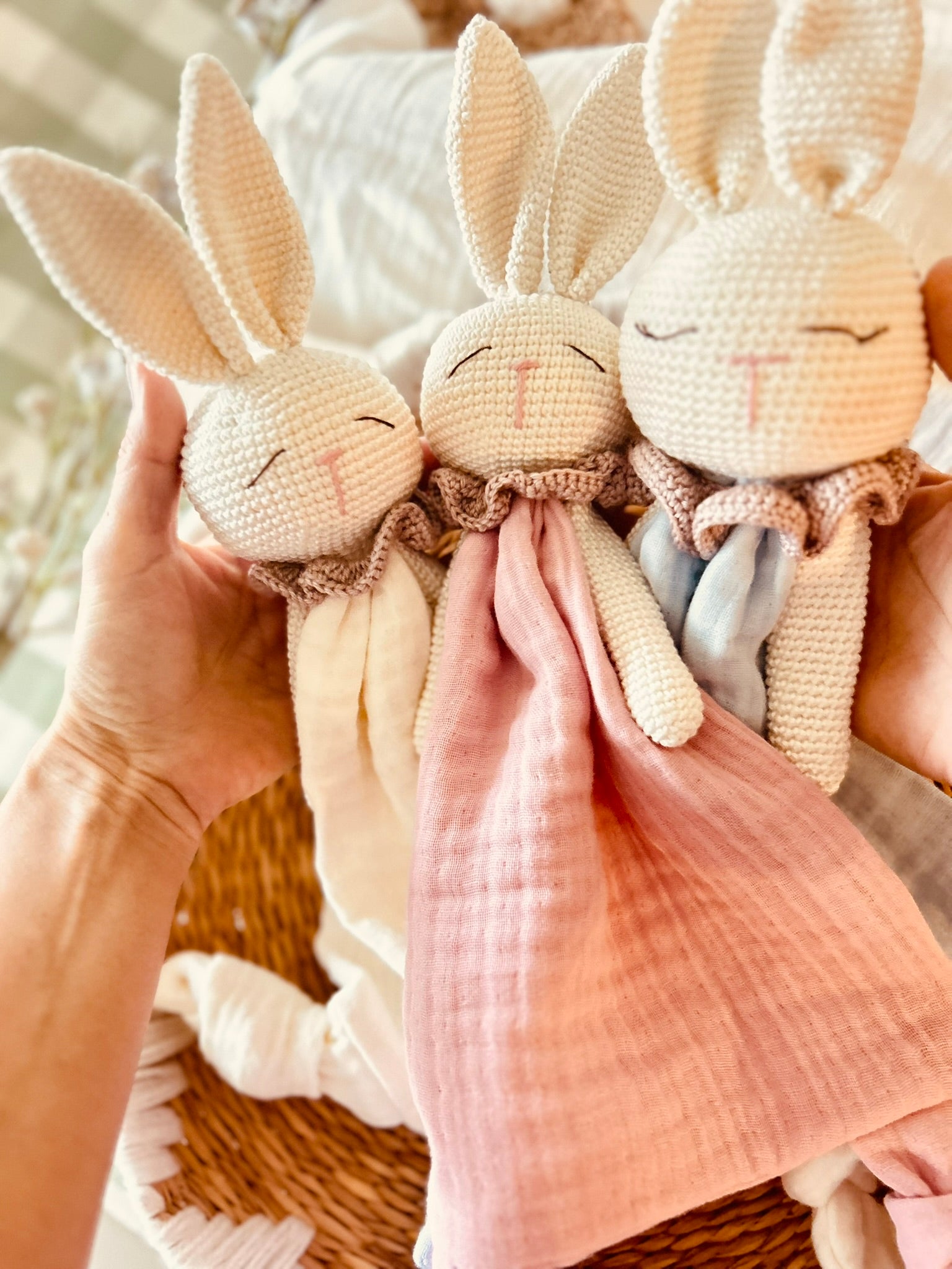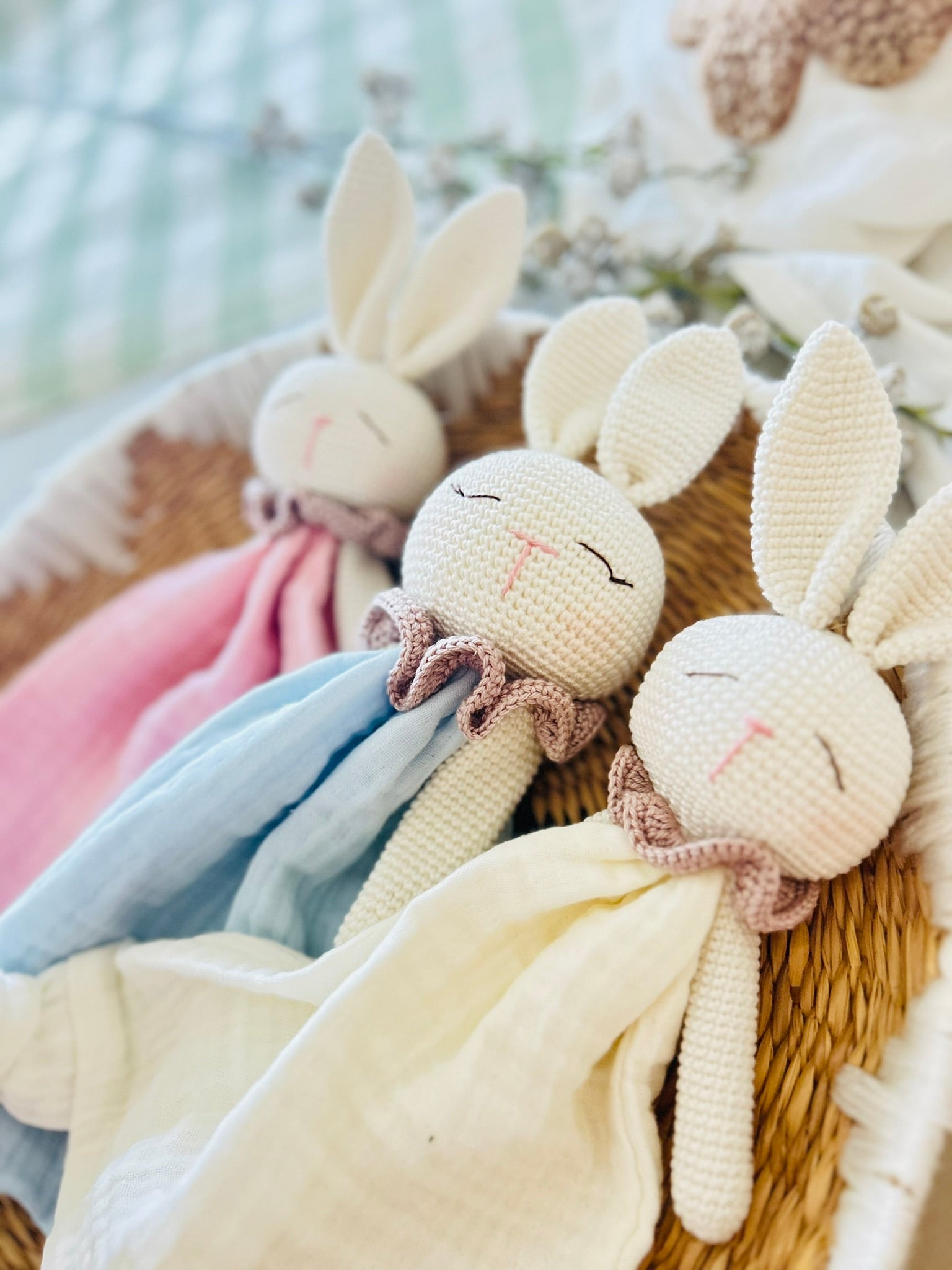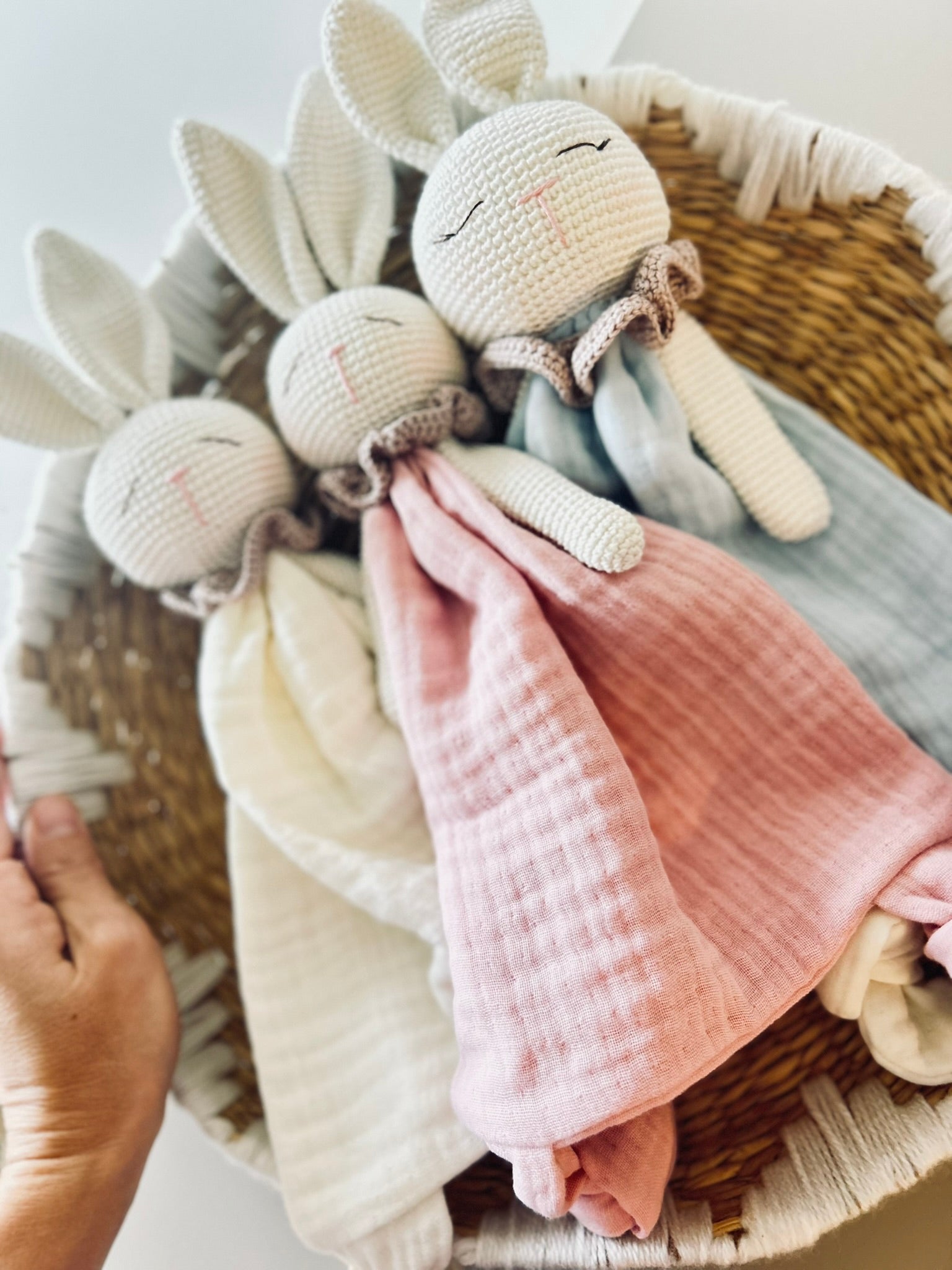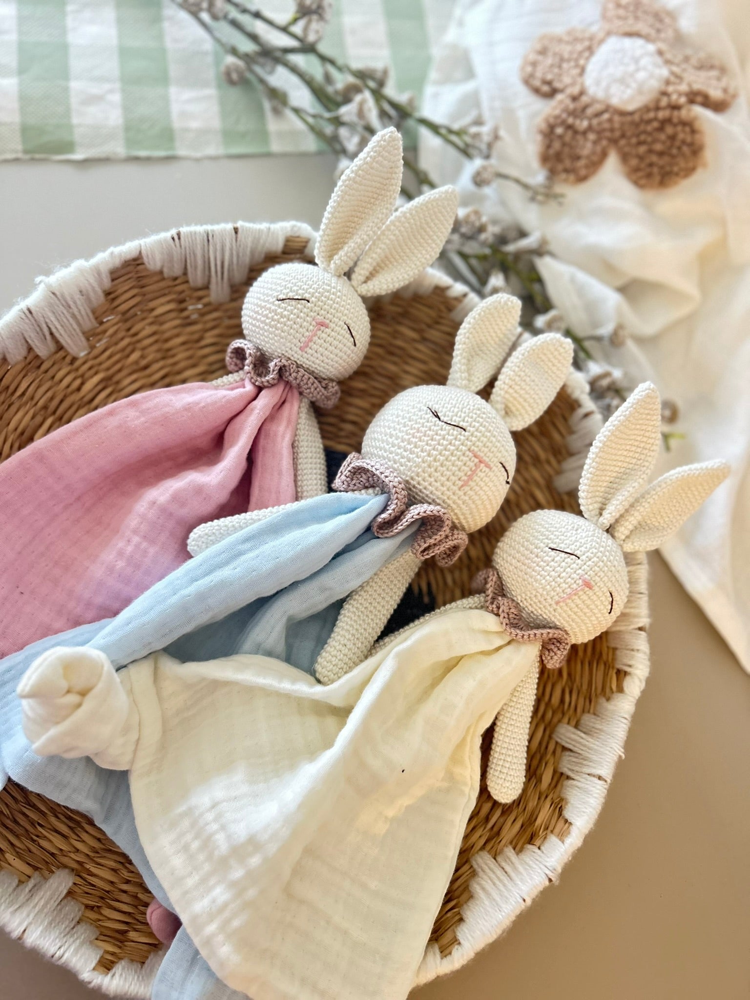 Introducing our enchanting Amigurumi Crochet and Muslin Baby Lovey Blanket, the perfect combination of comfort and charm for your little one. This delightful lovey features a soft, breathable muslin fabric, ideal for snuggling, and a whimsical hand-crocheted amigurumi character that adds a touch of playful magic. Crafted with love and attention to detail, the amigurumi character is made from high-quality, non-toxic yarn, ensuring it's safe and gentle against baby's delicate skin. The muslin blanket, known for its lightweight and breathable properties, provides warmth without overheating. Available in a variety of adorable designs and soothing colors, this baby lovey is not only a comforting companion but also a beautiful addition to any nursery. Perfect for cuddles, nap time, and on-the-go adventures, it's a thoughtful gift that both parents and babies will adore.
