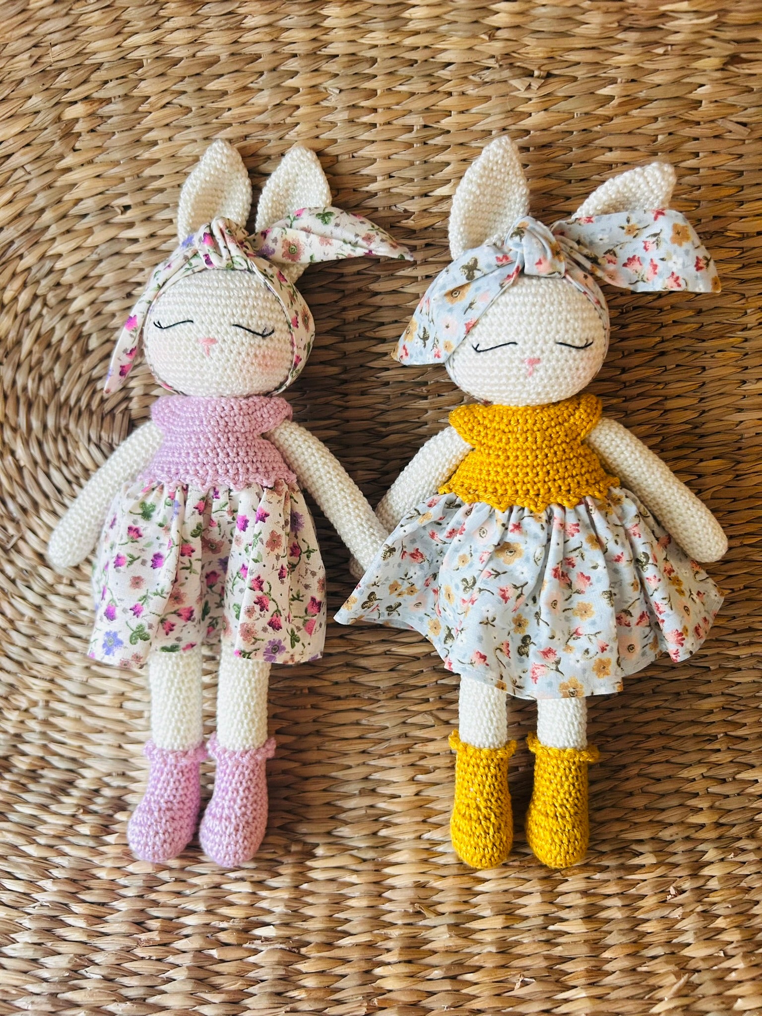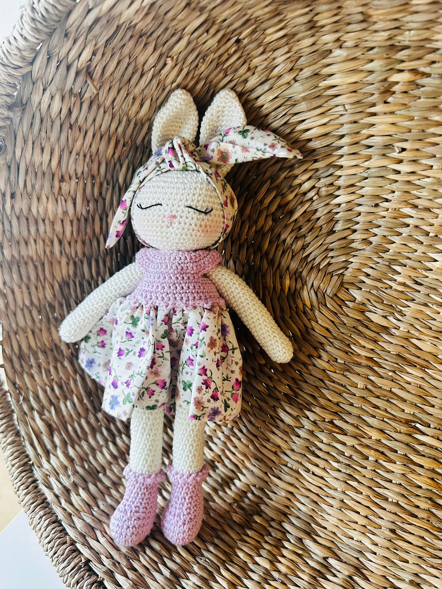 Our delightful Amigurumi Bunny Doll, a charming handcrafted creation that brings warmth and whimsy to any space. This adorable bunny, with its soft, crocheted texture, is lovingly made from high-quality cotton yarn, ensuring a gentle touch perfect for cuddling. Standing at approximately 12 inches tall, this bunny comes dressed in a removable, hand-stitched outfit, featuring a stylish little dress and a matching bow, adding a splash of color and personality. Ideal as a unique gift or a cherished keepsake, this amigurumi bunny is suitable for both children and adults alike. Whether sitting on a nursery shelf or nestled in the arms of a loved one, our Amigurumi Bunny Doll is sure to capture hearts with its cute, timeless appeal.