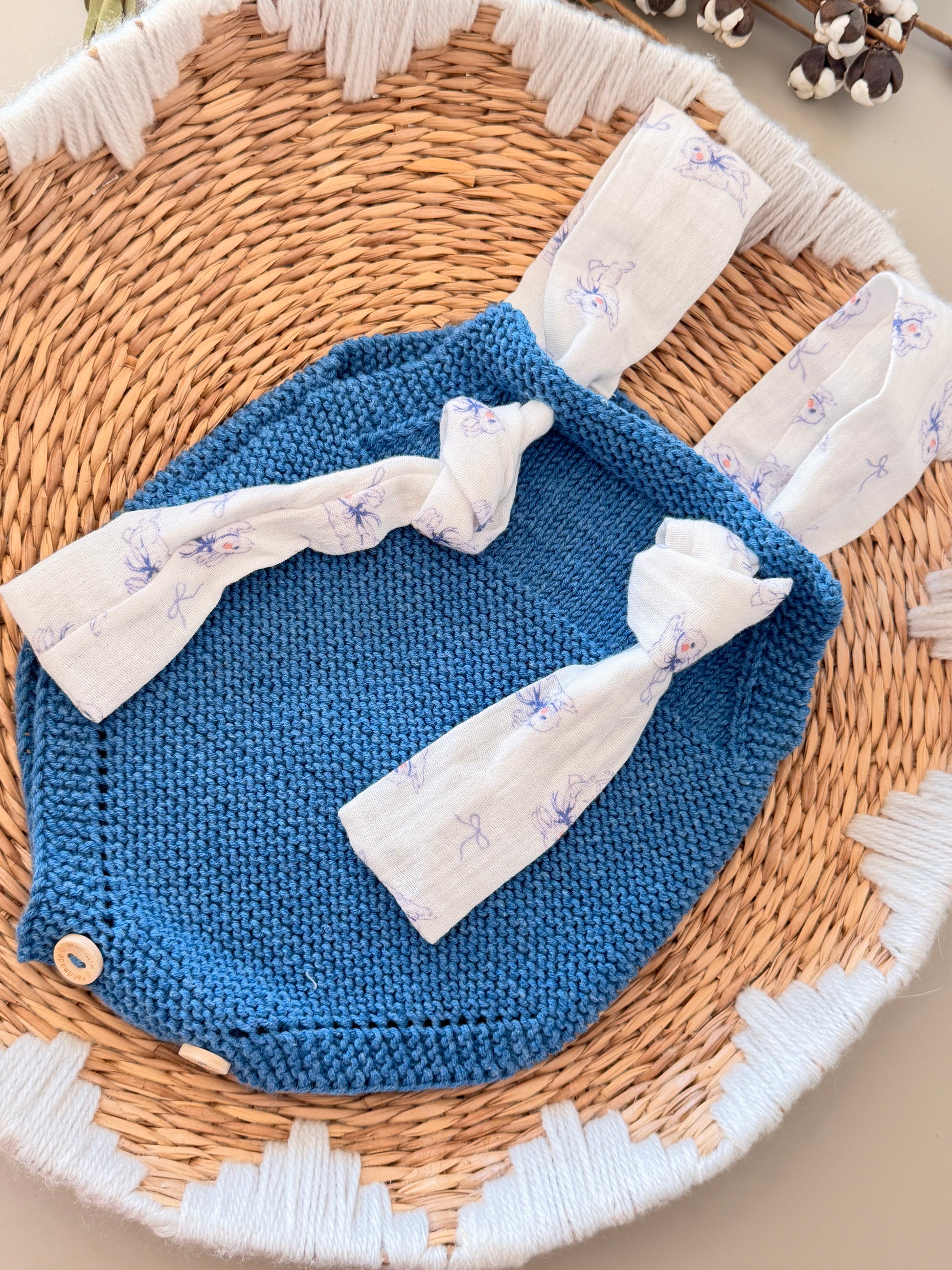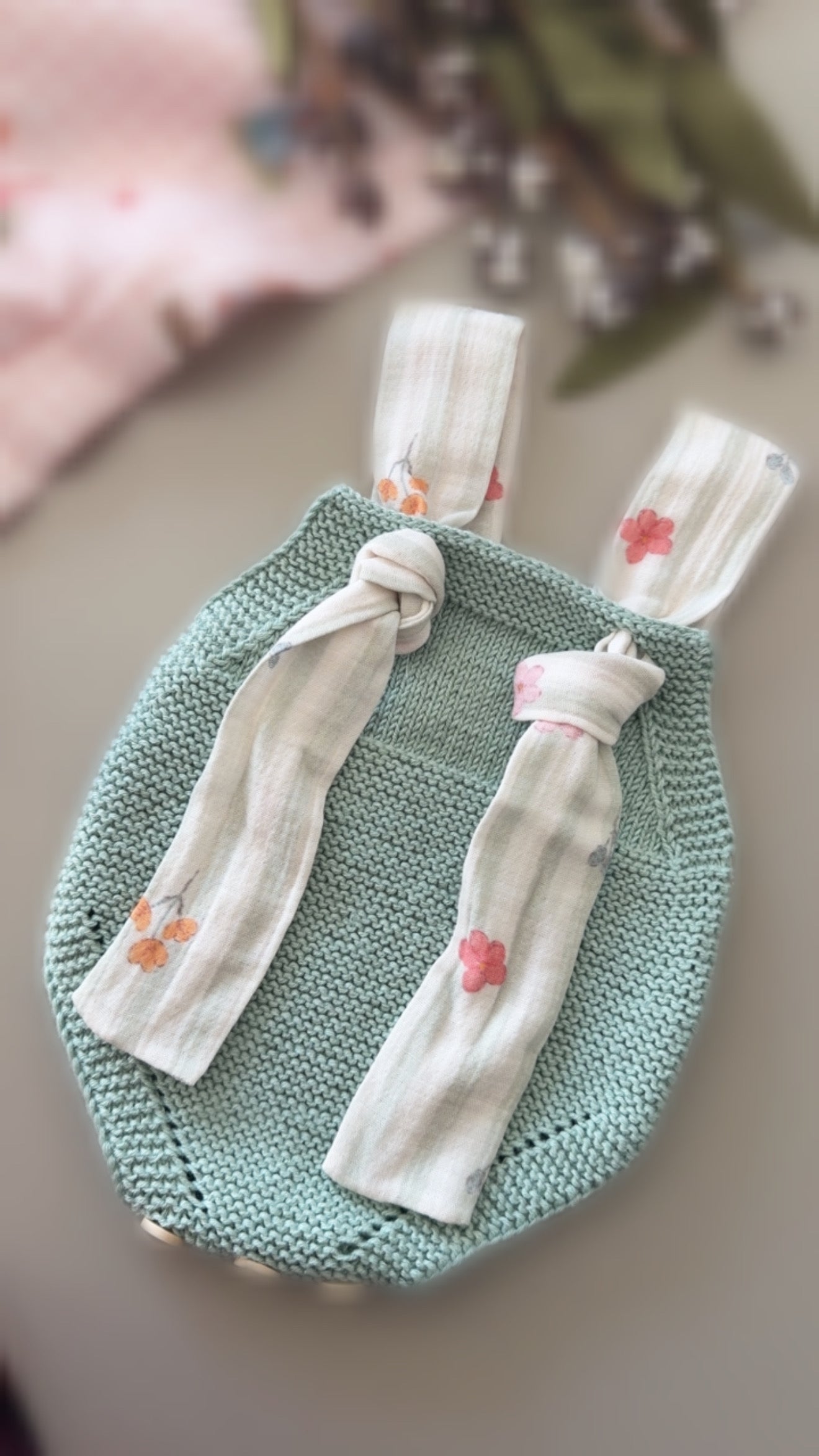 Hand-Knit Baby Romper with Muslin Tie Straps