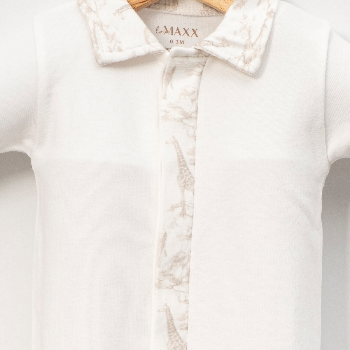 A delicate baby girl romper set designed in soft cream tones, featuring refined étoile (star) pattern details. The footed long-sleeve romper is finished with a ruffled collar and paired with a matching bonnet and bib for a timeless, elegant newborn look.