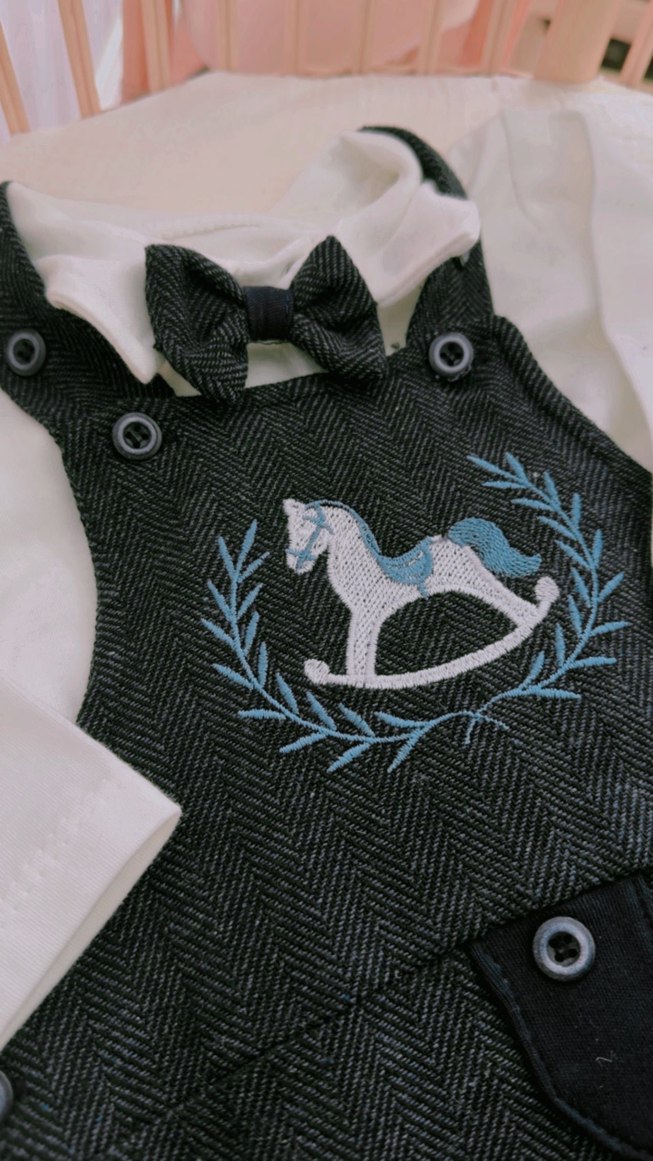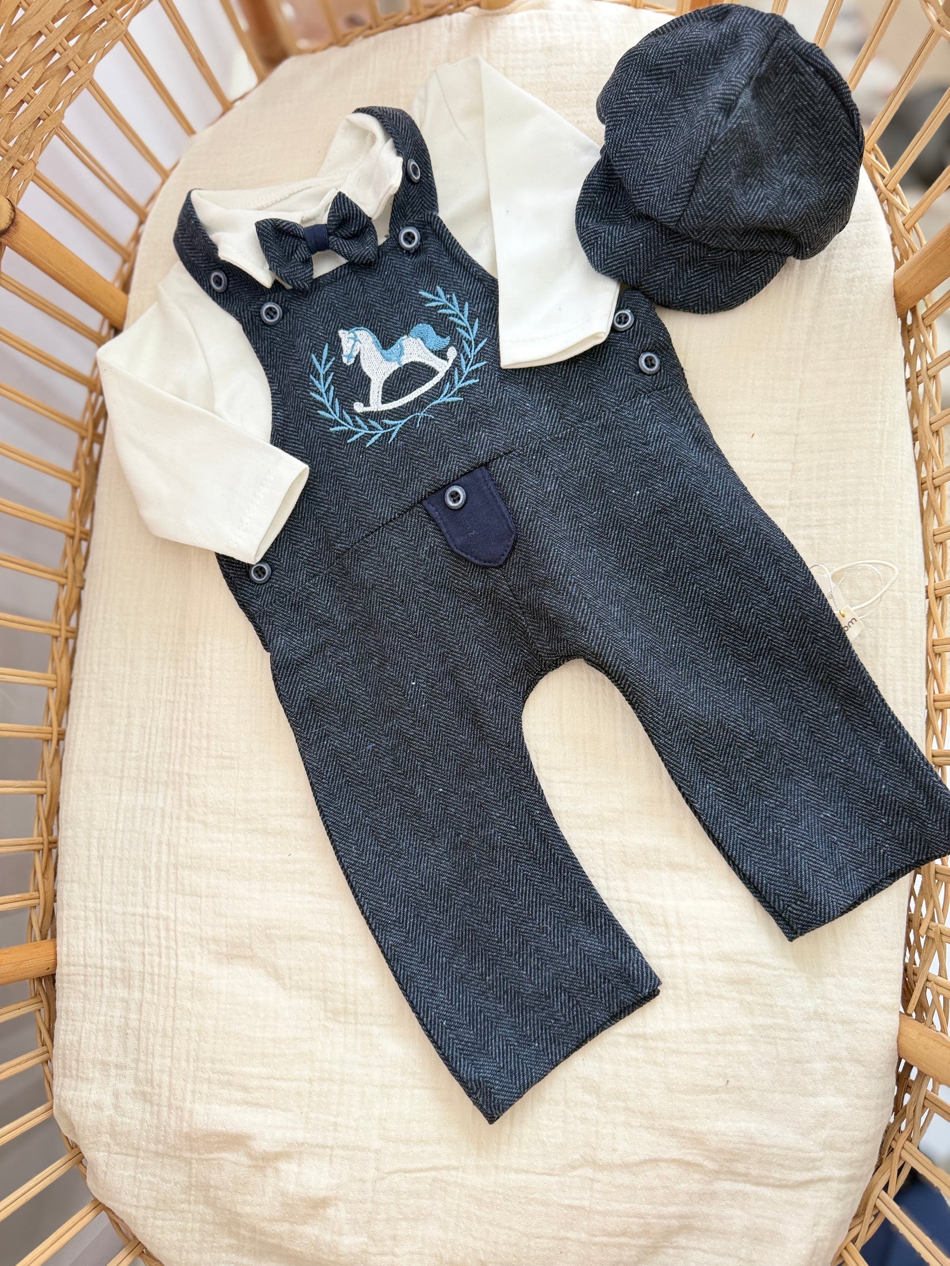 This 2-piece baby set features a soft long-sleeve collared top with a charming bow-tie detail, paired with classic herringbone-style overalls. The overalls are finished with an embroidered teddy bear pocket, adjustable shoulder straps, and reinforced knee patches — blending heirloom character with thoughtful practicality.
