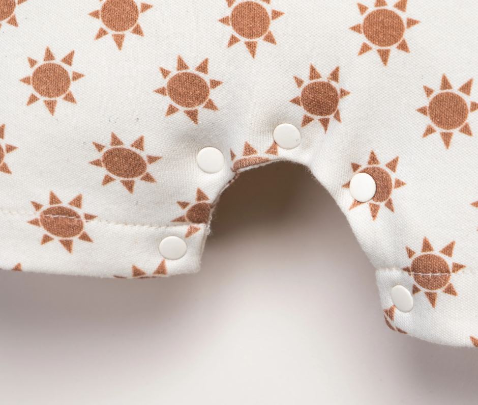 Embrace sunny days with our Bohemian Summer Cotton Baby Romper, featuring an adorable all-over sun print and a minimalist front patch design. Crafted from 100% soft, breathable cotton, this romper keeps your little one cool and comfy through warm weather adventures. The earthy tones and boho-inspired patterns bring effortless charm, while the snap closures make outfit changes quick and easy. A must-have for every little free spirit’s summer wardrobe — where comfort meets bohemian style.