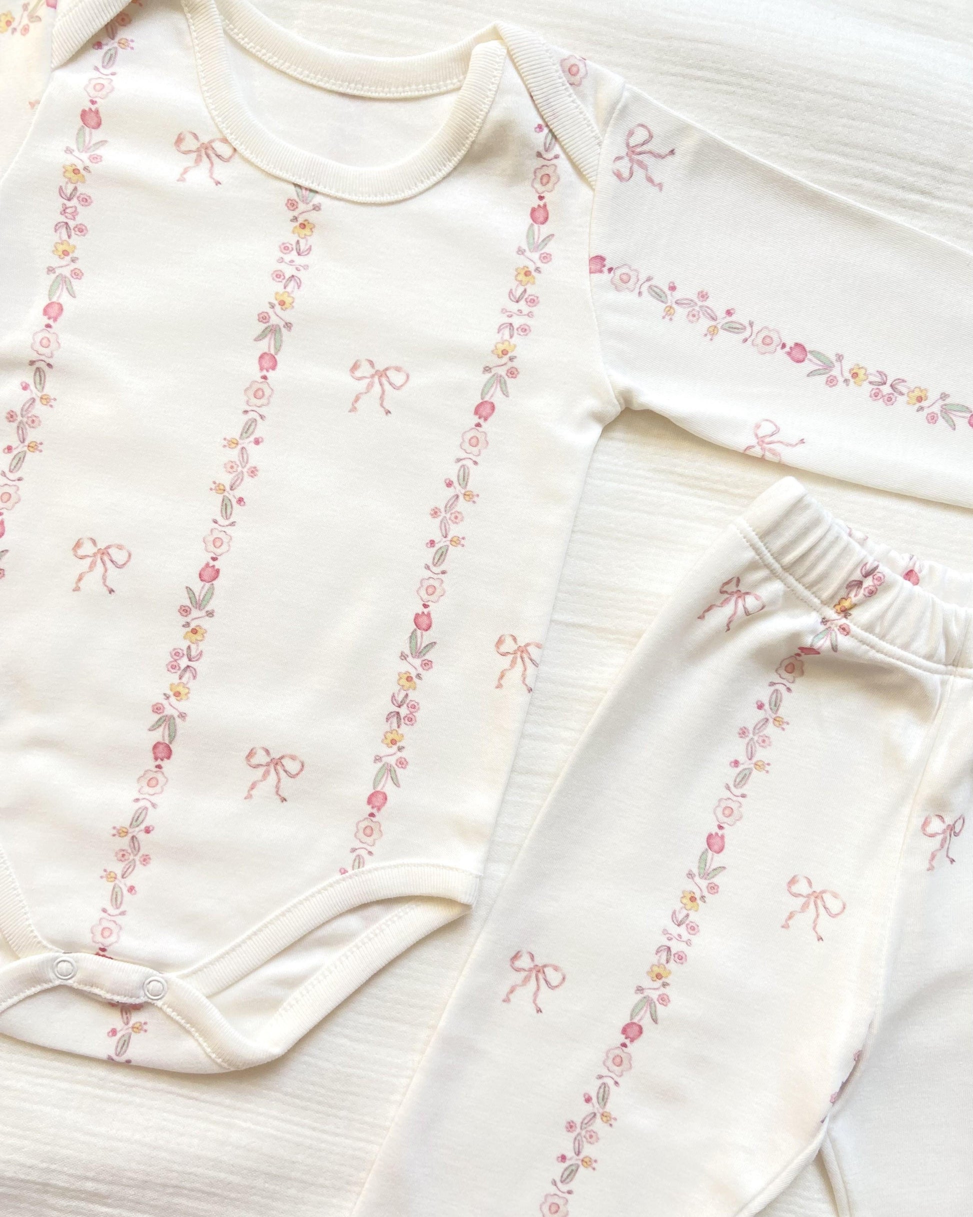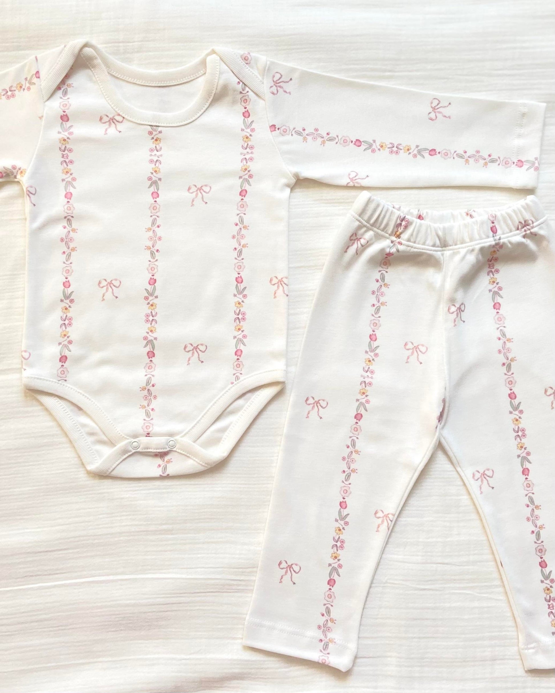 The set includes a long-sleeve bodysuit with easy snap closures and matching elastic-waist pants, making dressing and diaper changes effortless. Printed using organic, baby-safe dyes, this timeless design blends comfort, quality, and sweetness—ideal for gifting or daily essentials.