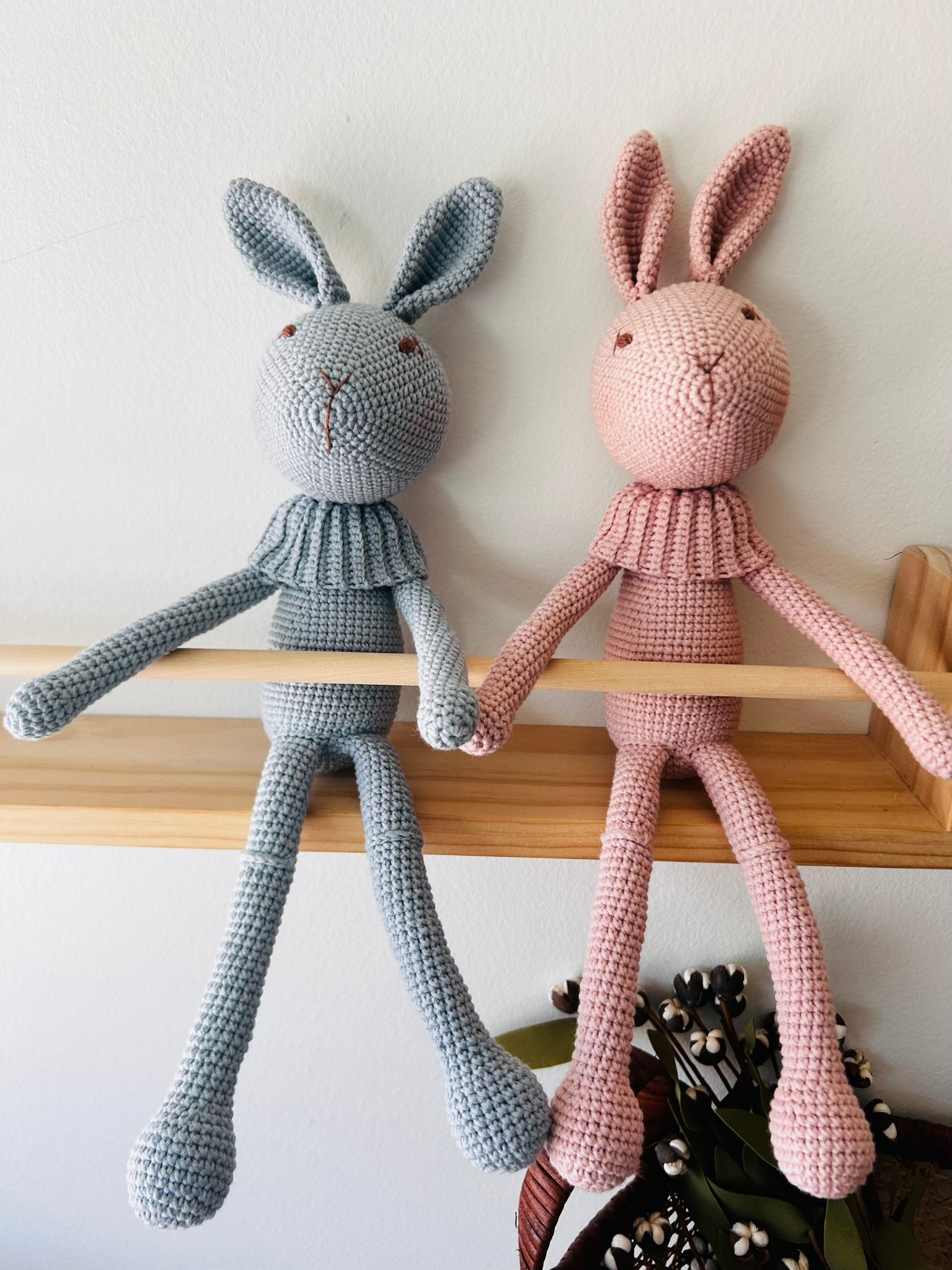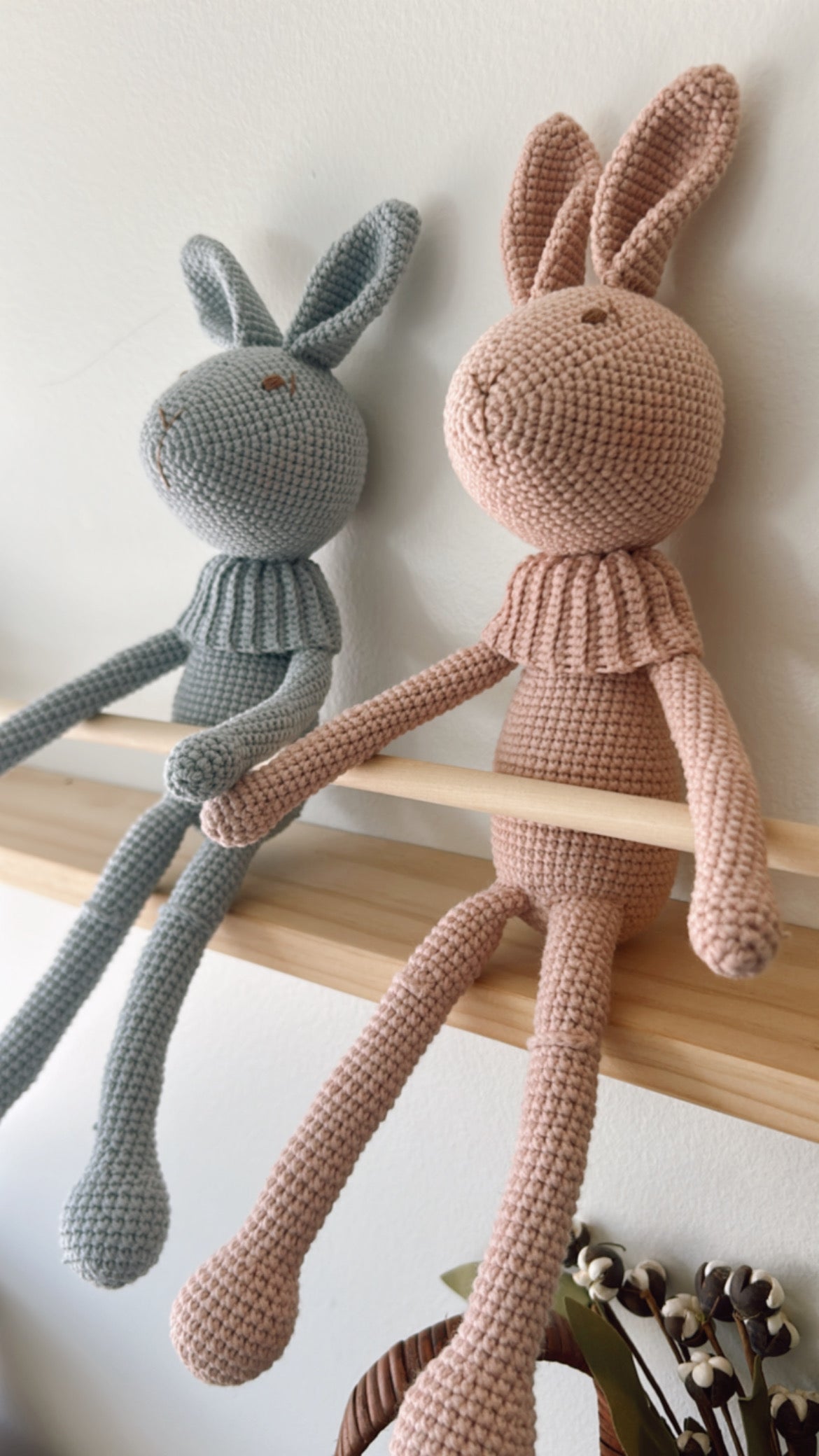 Meet Bunny, the perfect addition to your home decor or bedtime routine. This tall, handmade bunny can serve as a charming shelf decoration or a cuddly companion for a good night's sleep. Get ready to add a touch of cuteness and coziness to your space with Bunny.