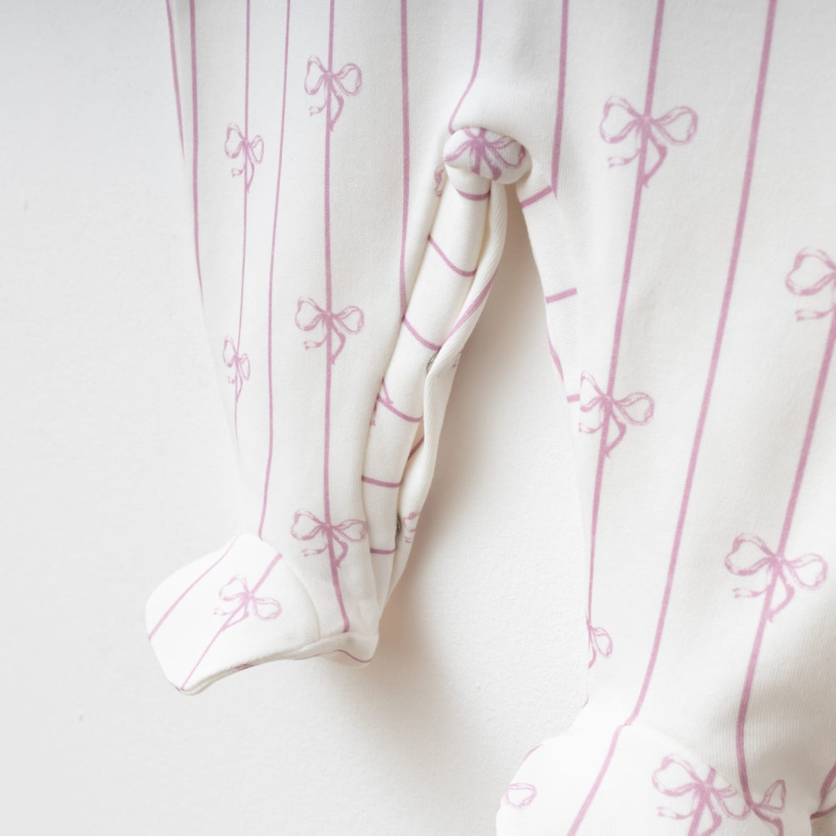 This charming cotton baby girl sleeper is designed to wrap your little one in softness, comfort, and timeless elegance. Featuring a delicate bow print with soft pink stripes and a sweet ruffled collar, this footed one-piece brings a classic, heirloom feel to everyday baby wear.