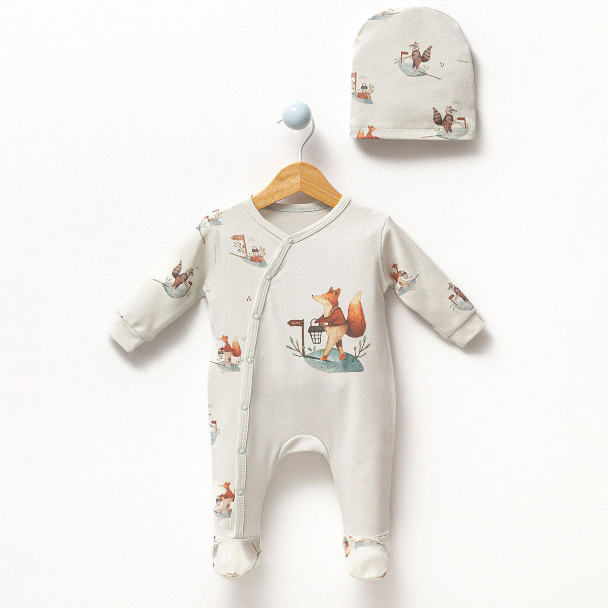 This enchanting 2-piece cotton baby set features a charming fox woodland illustration, bringing a soft storybook feel to your little one’s wardrobe. Designed in calming neutral tones, the set includes a footed cotton sleeper and a matching beanie hat, making it both practical and irresistibly sweet.