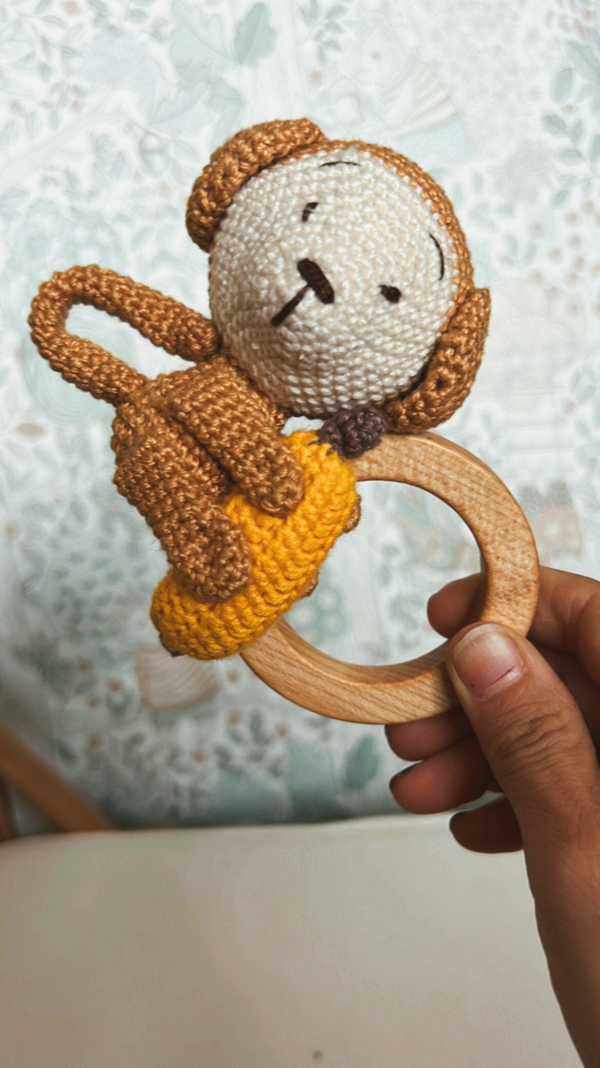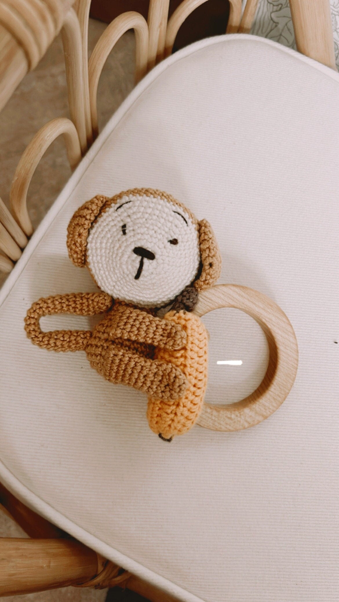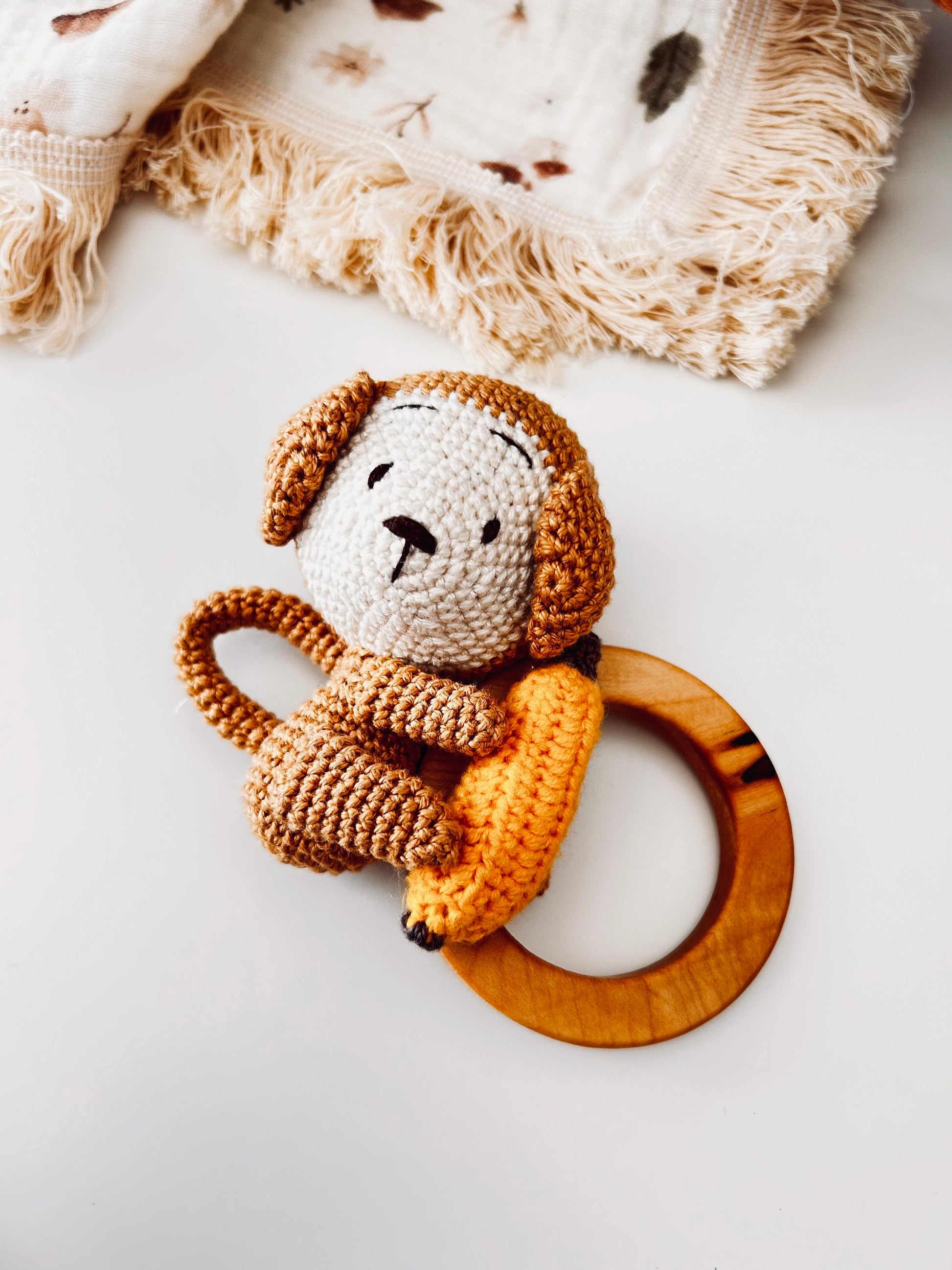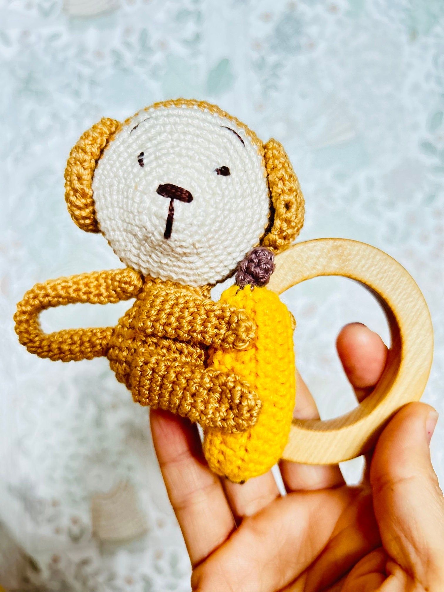 Gift for Newborn, Monkey Crochet Rattle Teether, Crochet Monkey with Banana Rattle