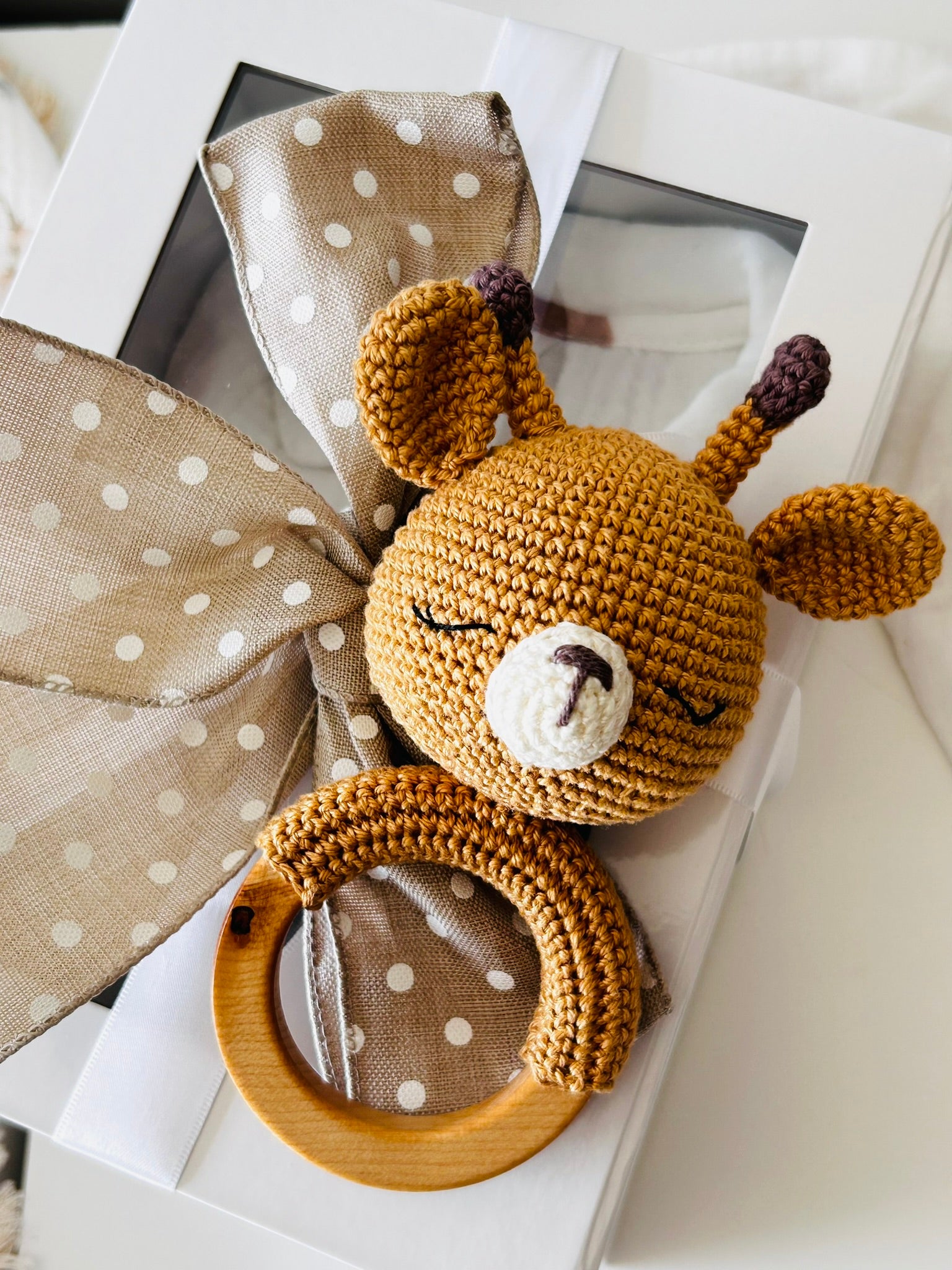 Handmade baby rattle makes a lovely present for new parents or first-time moms. It comes in a white cotton bag for easy gifting and is sure to impress any mom-to-be with its unique handmade touch. Enjoy a hassle-free online gift shopping experience by including a complimentary gift tag with your order and providing us with the recipient's and sender's names. We'll take care of writing them for you and sending the gift without a receipt.
