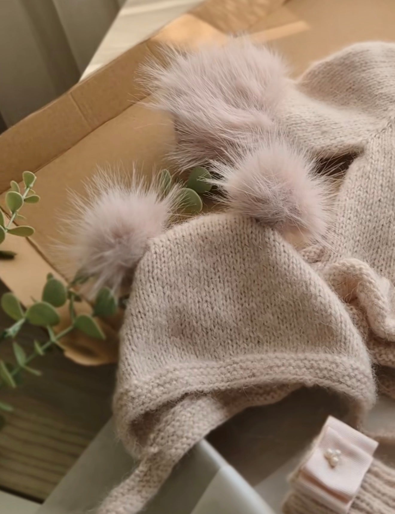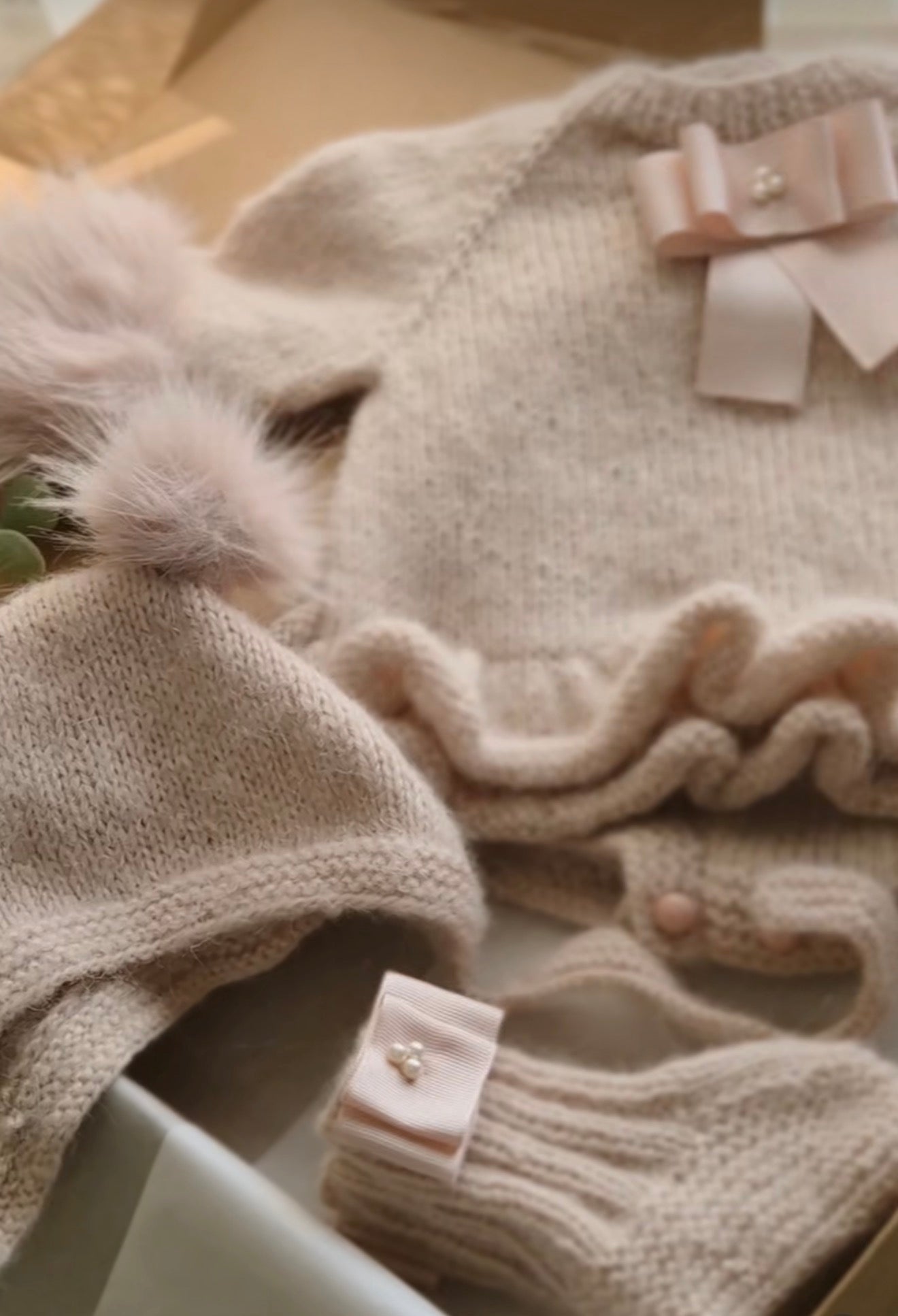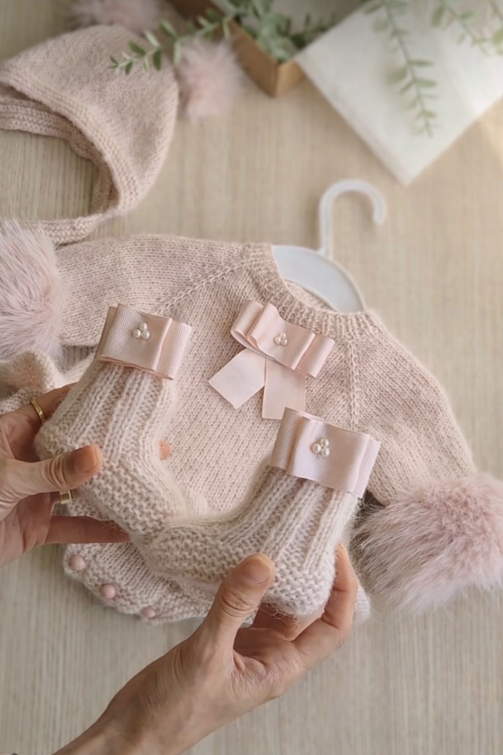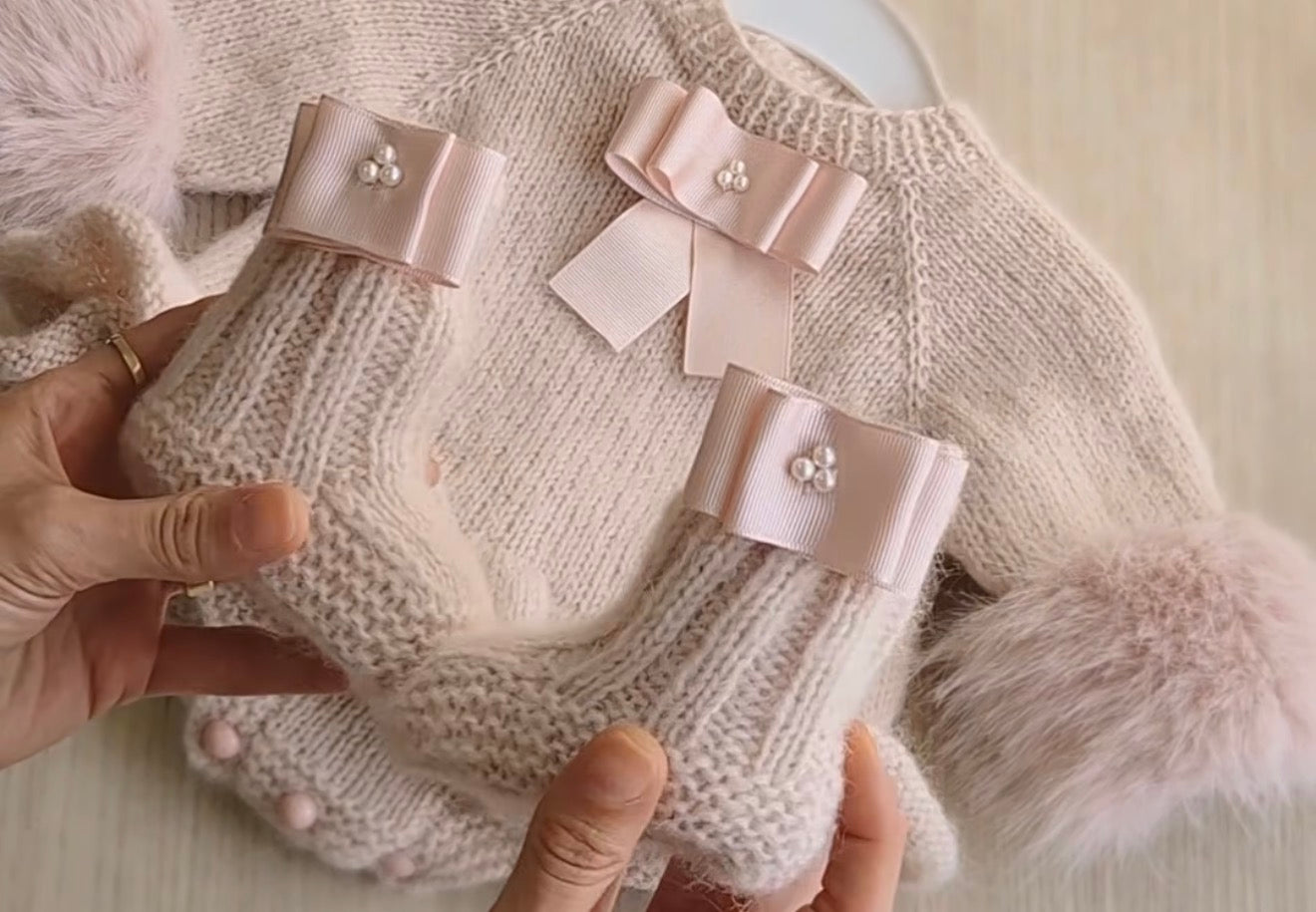 Crafted from luxurious alpaca wool, this enchanting three-piece set transforms newborn photography into timeless art. The soft light pink ensemble features a charming pom-pom bonnet, pearl-detailed booties, and a delicate romper adorned with ribbon accents—each piece thoughtfully designed to create those precious first-year memories. Perfect for milestone photos or as a cherished heirloom gift, this handmade collection brings Parisian elegance and vintage charm to every special moment. A truly unique treasure for parents who appreciate handcrafted quality and timeless style.