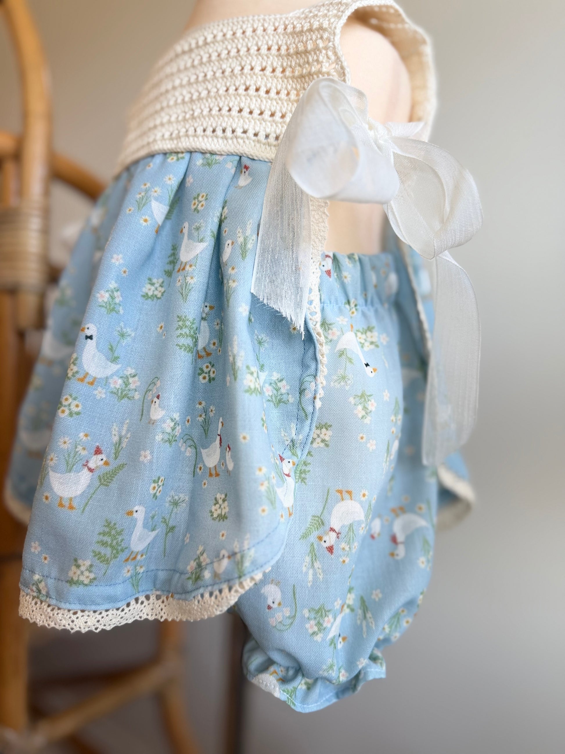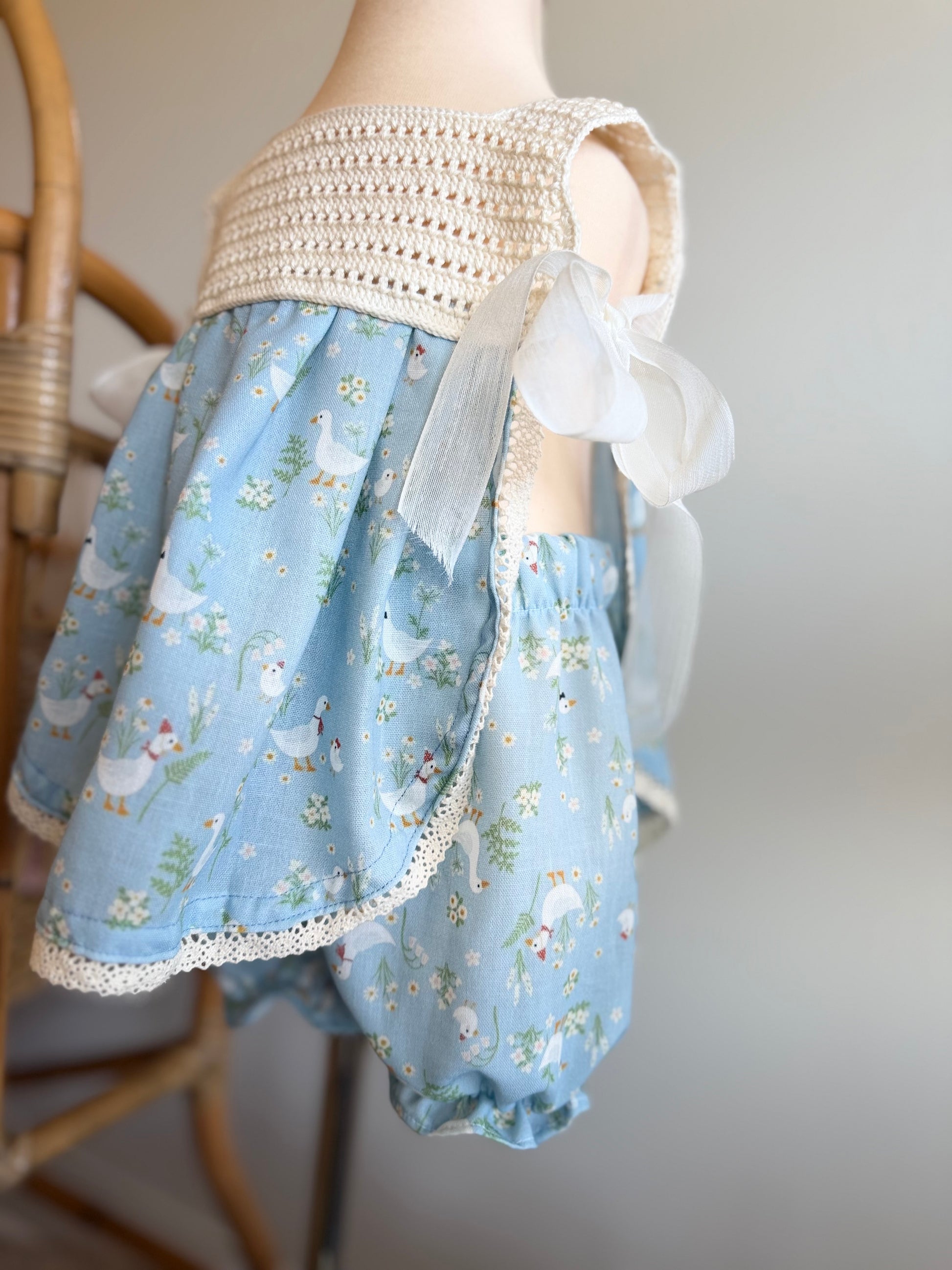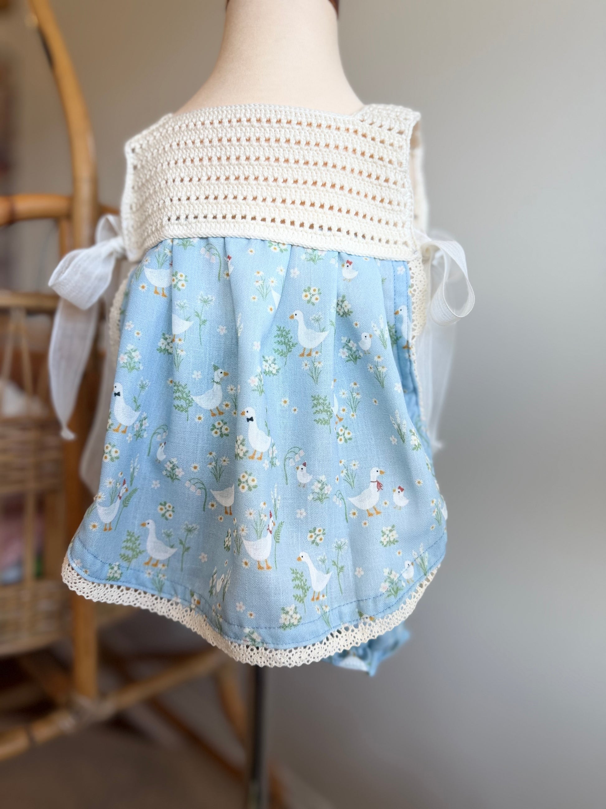 This charming two-piece set combines handmade crochet details with a delightful cotton goose print, creating a one-of-a-kind look that's as fun to wear as it is to admire. The adjustable design grows with your little one, while the unique textile blend offers both comfort and visual interest. Perfect for playdates, casual outings, or cozy days at home—a playful wardrobe essential that celebrates artisanal craftsmanship!