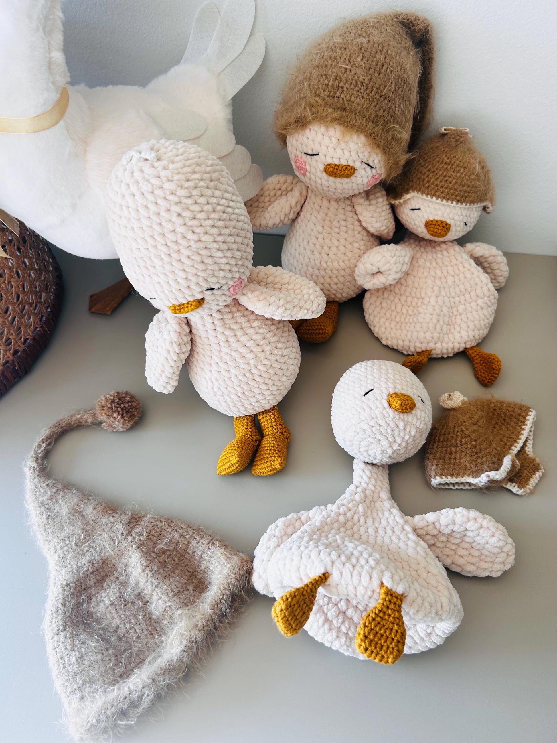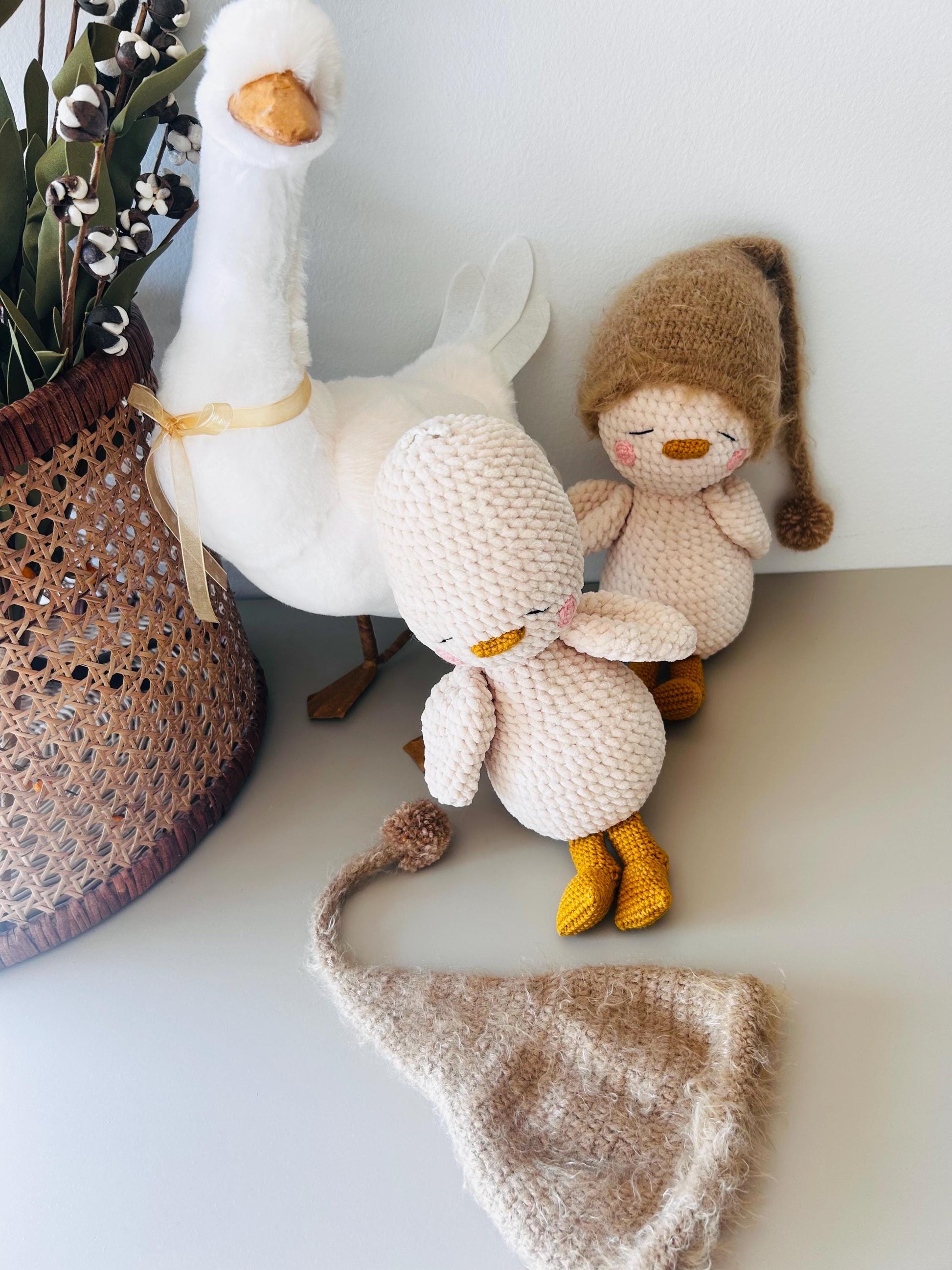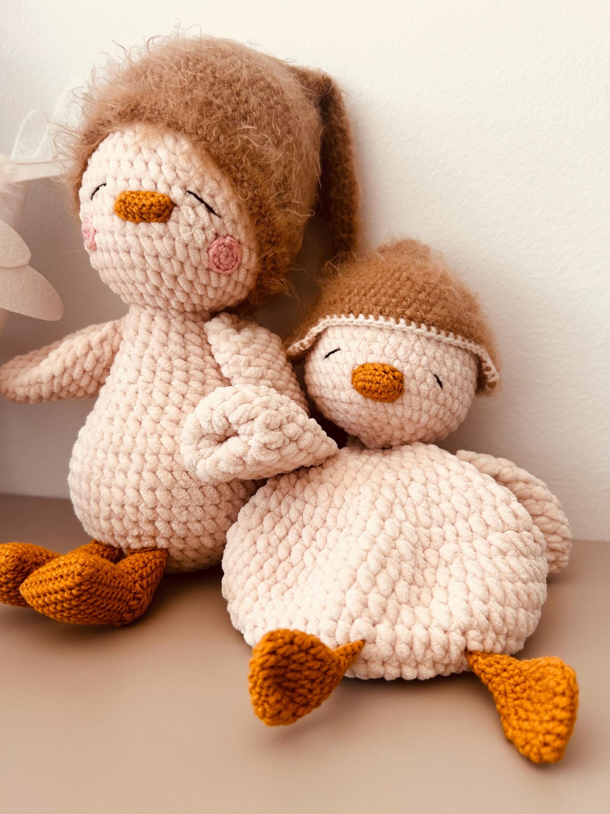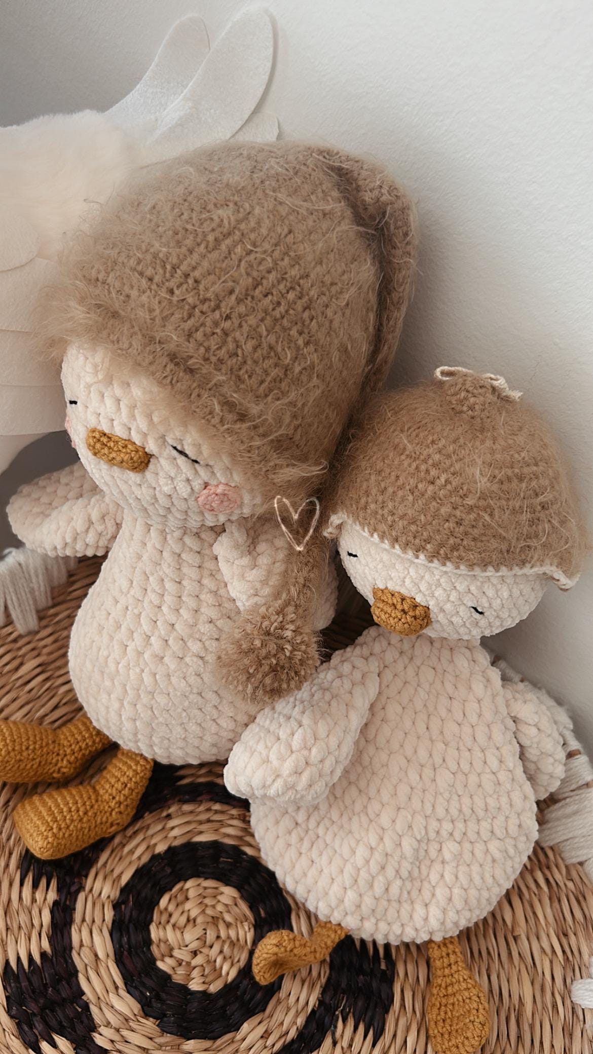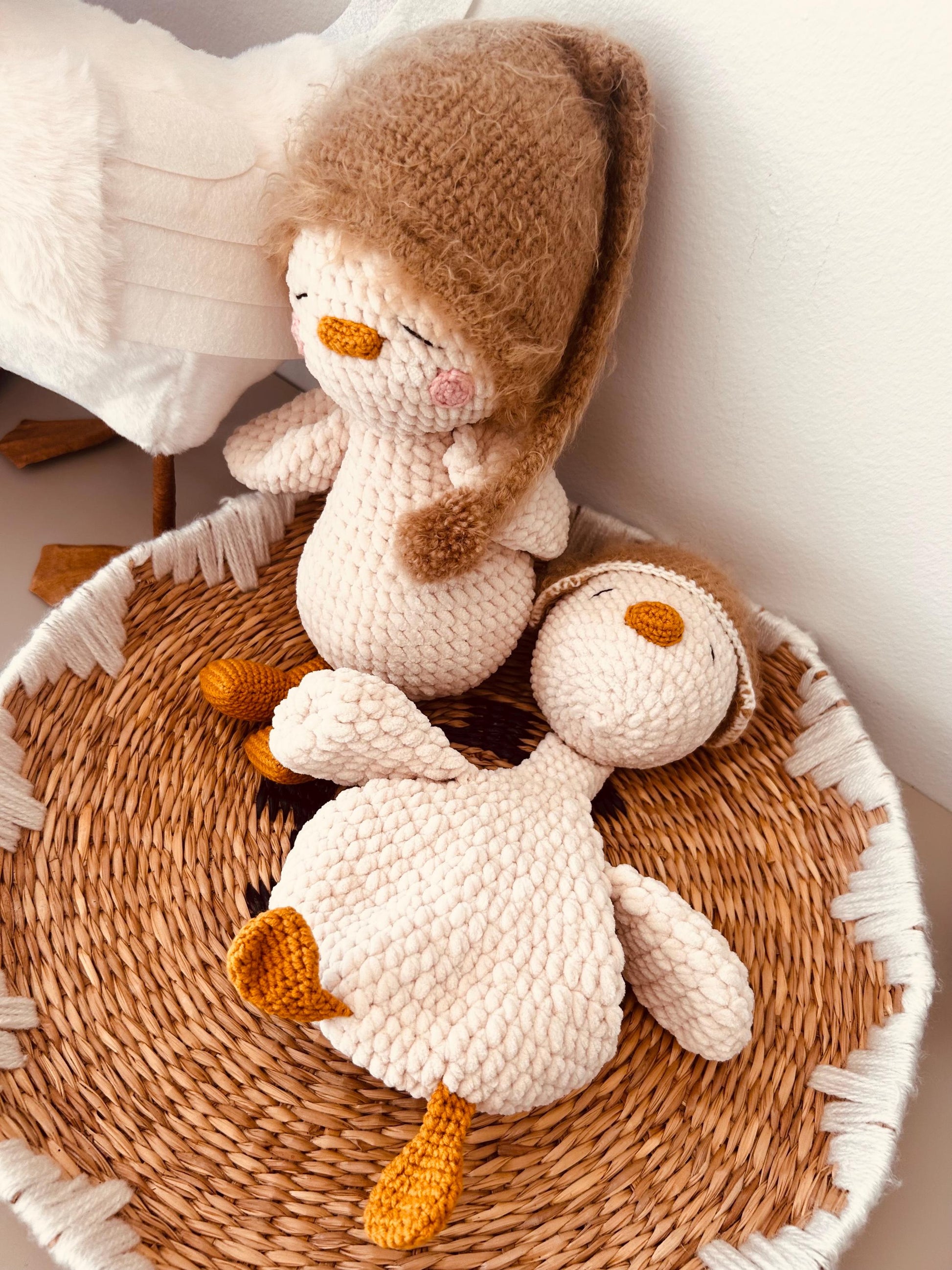 This adorable handmade crochet goose set includes a cuddly stuffed goose toy and a matching lovey, perfect for bringing warmth and comfort to your little one. Crafted from super-soft, high-quality yarn, these sweet geese feature gentle neutral tones, mustard feet, fluffy brown hats, and embroidered sleepy eyes – making them safe for babies and toddlers.