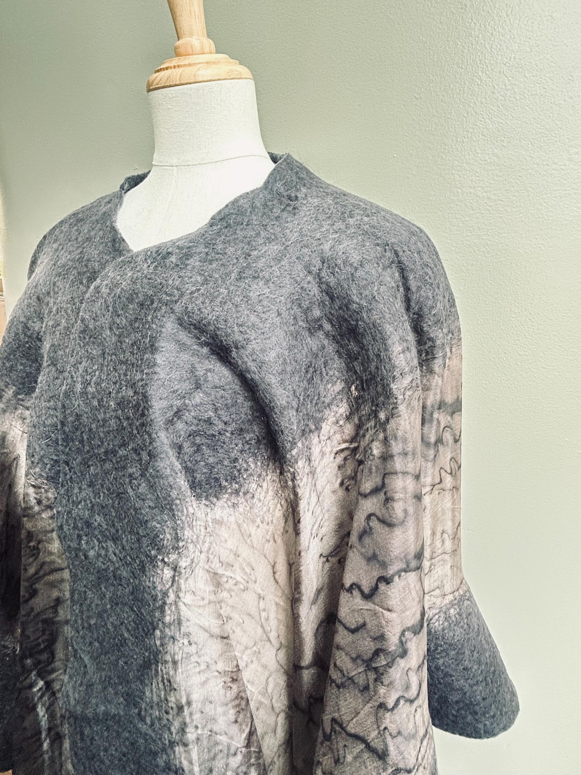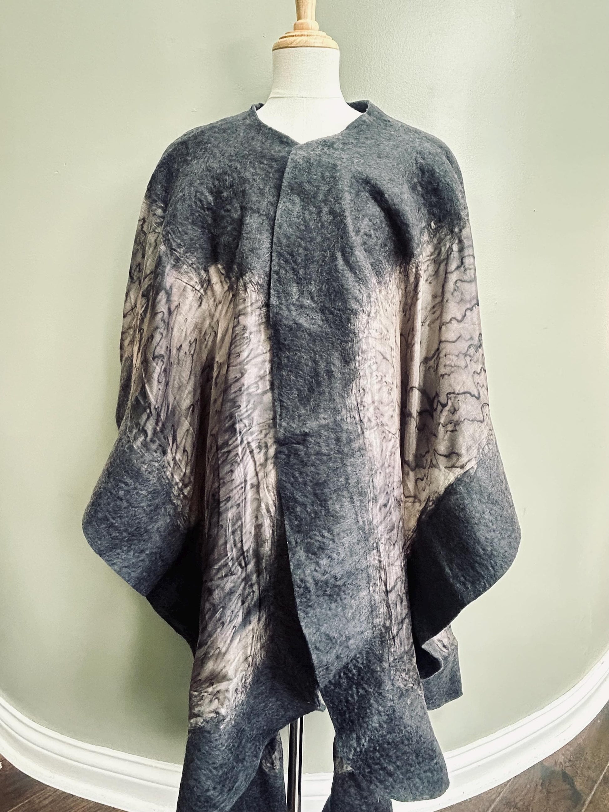 Wrap yourself in timeless elegance with this handcrafted silk and felt poncho, made using the nuno felting technique — where soft merino wool is delicately bonded with pure silk fabric.