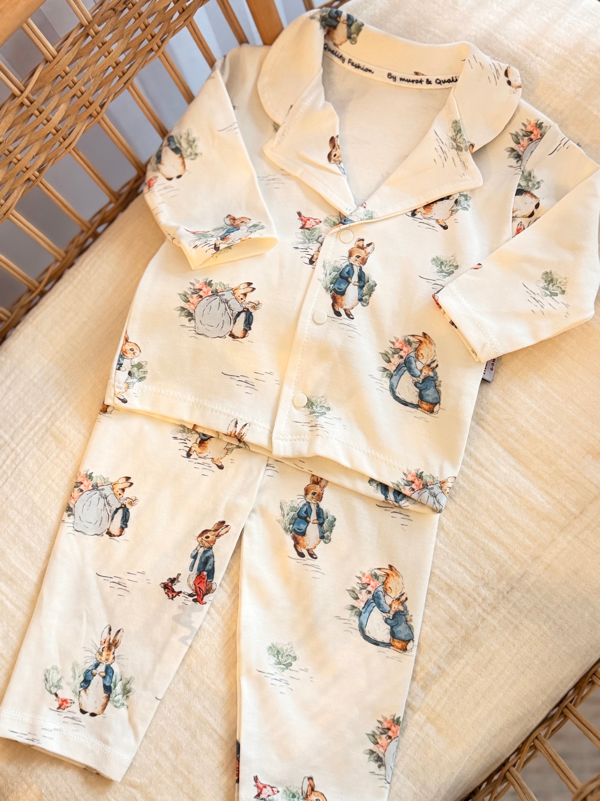 The set includes a button-front long-sleeve top with a delicate collar and matching elastic-waist pants, all crafted from ultra-soft, breathable cotton fabric gentle on baby’s skin. The neutral cream base and vintage bunny motif make this piece perfect for boys or girls and easy to pass down through generations.