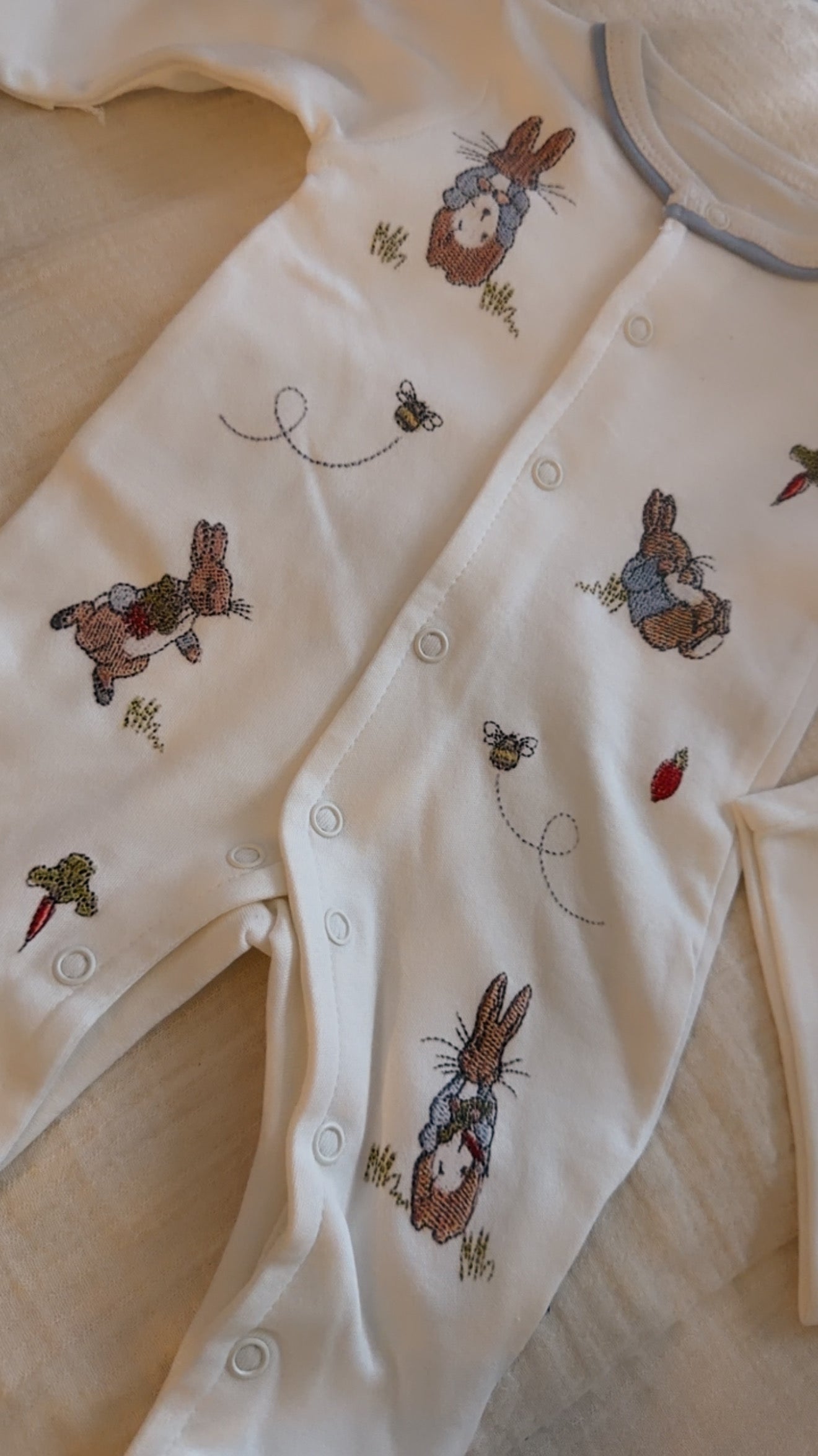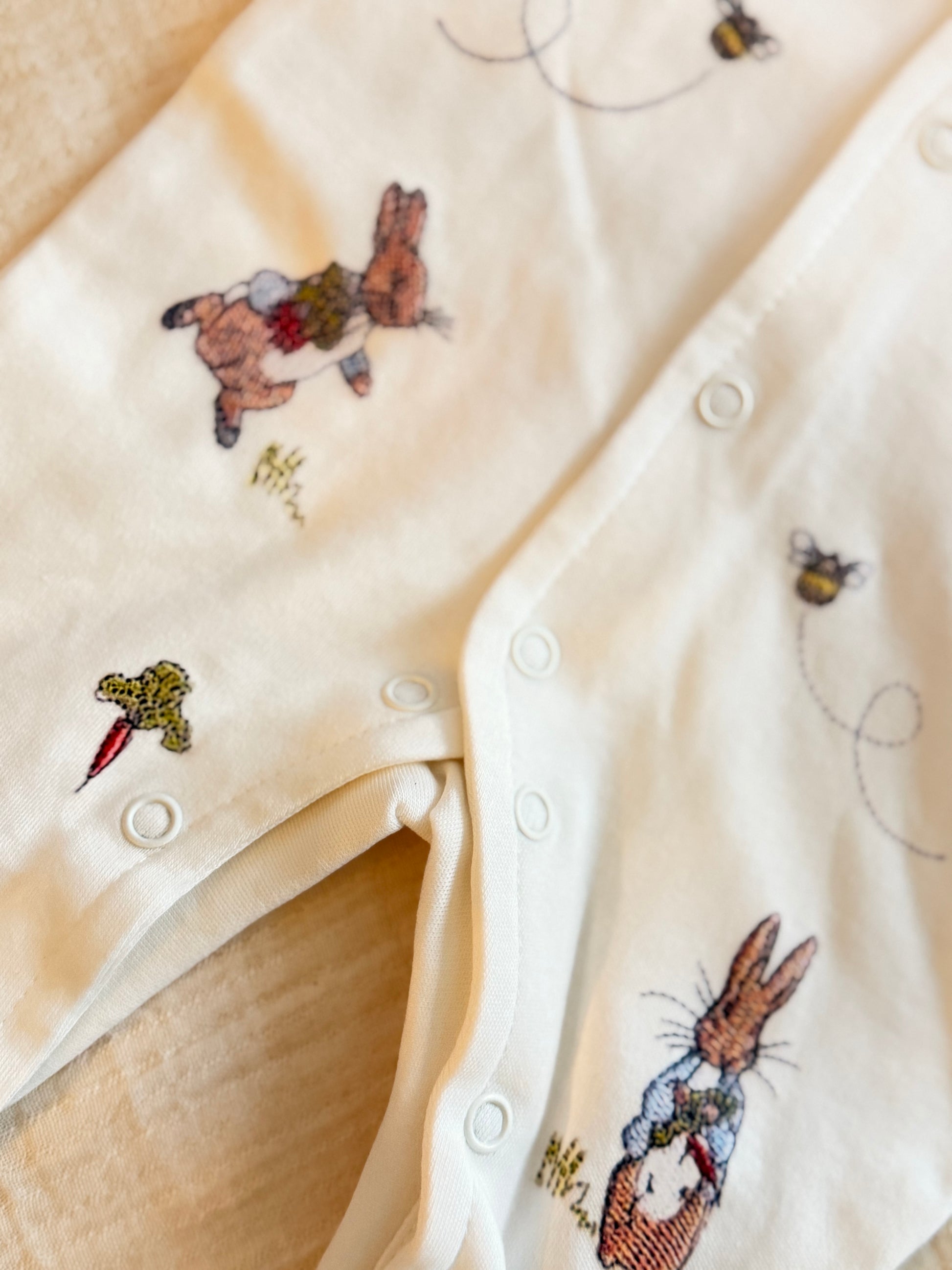 This soft footed baby sleeper features a delicate bunny and garden motif printed to look like embroidery, creating a beautiful heirloom aesthetic without raised stitching. Paired with a matching baby hat, this set is gentle on newborn skin while offering a classic, cozy look perfect for early days and special moments.