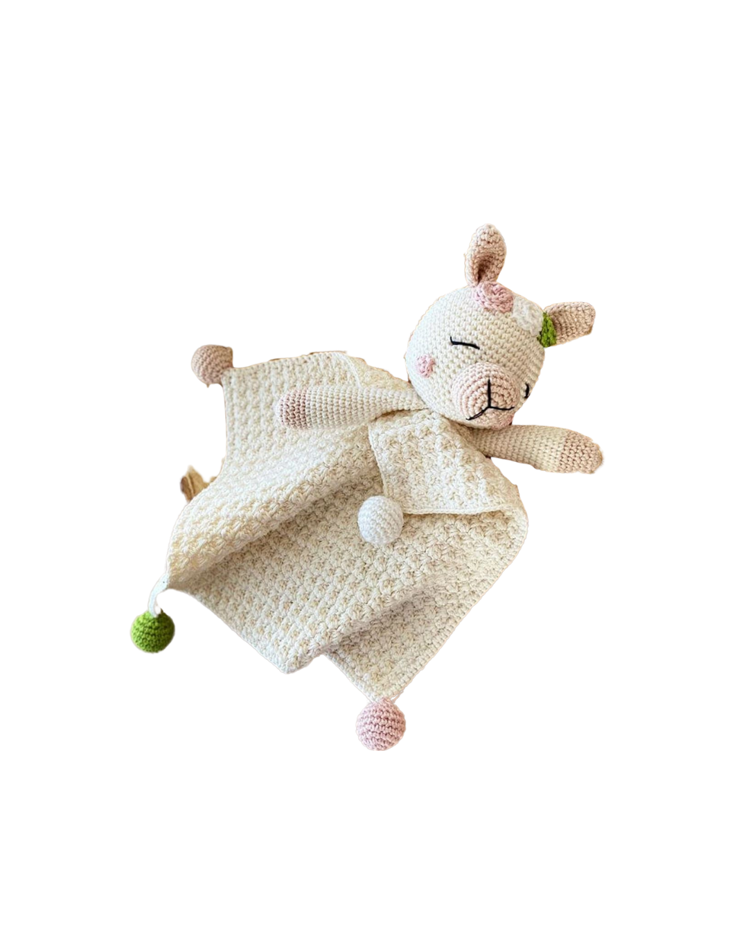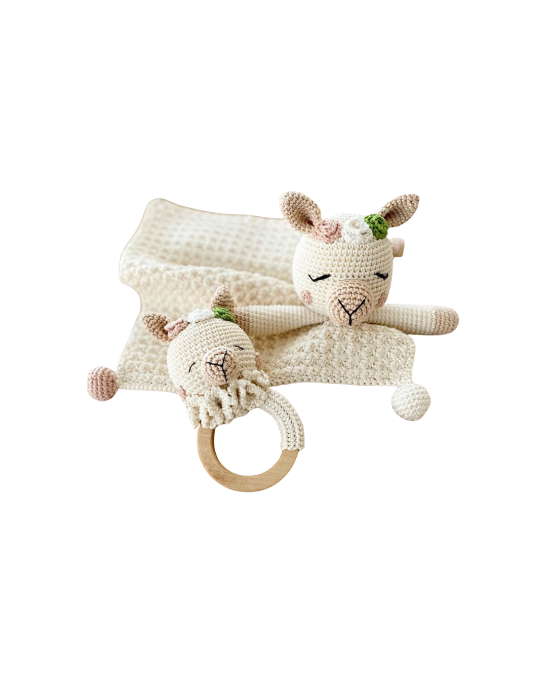 Designed with love and expertly crafted, the Llama Rattle and Lovey is a unique baby security blanket and matching rattle set. Made with soft crochet material, it's the perfect gift for baby showers. Give the gift of comfort and stimulation with this one-of-a-kind set.
