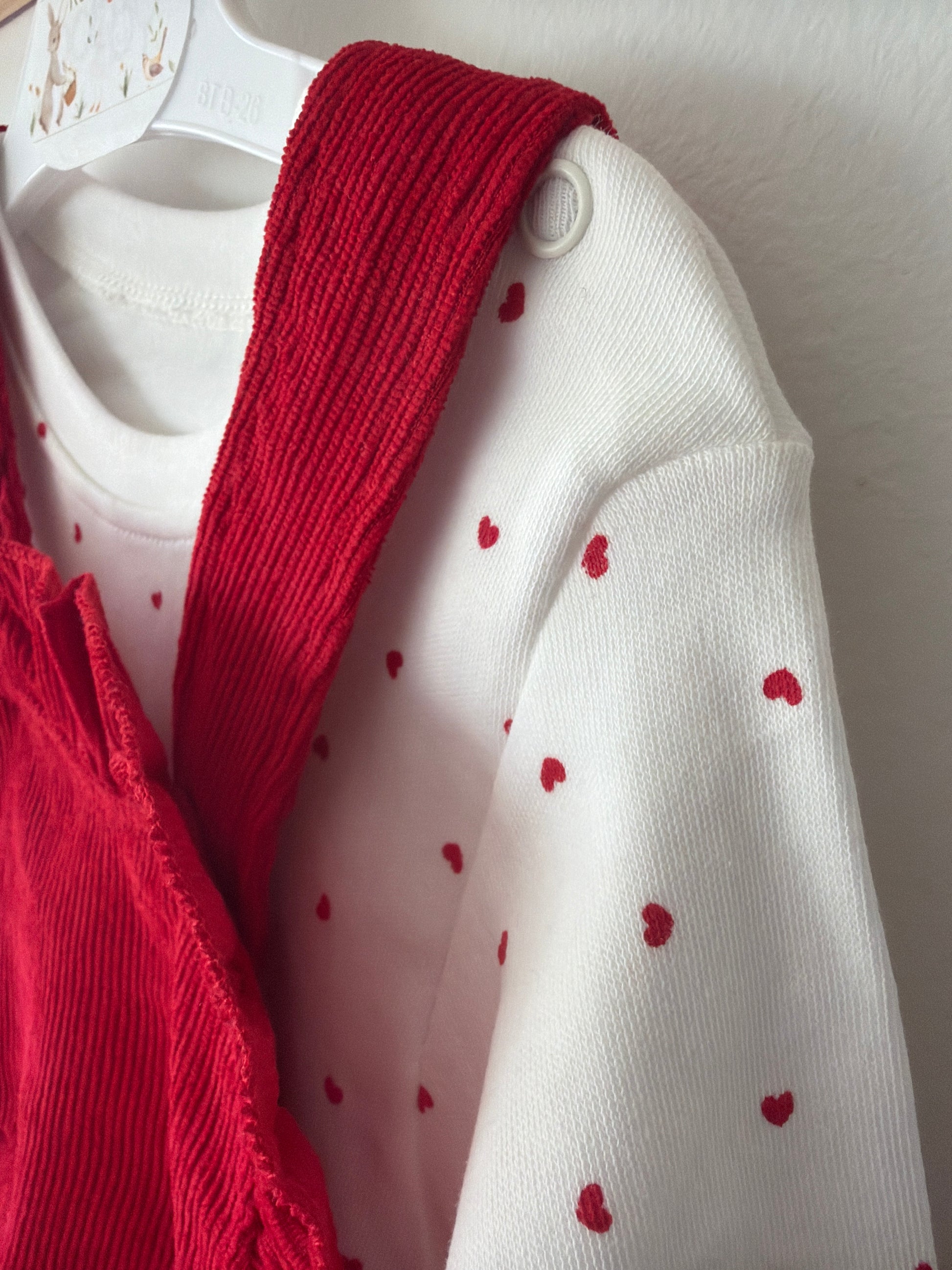 This charming set features a soft white long-sleeve top adorned with tiny heart prints, paired with a rich red corduroy overall finished with a beautiful heart-shaped ruffle detail at the front. The textured corduroy and sculpted heart silhouette create a truly special piece that feels both playful and heirloom-worthy.