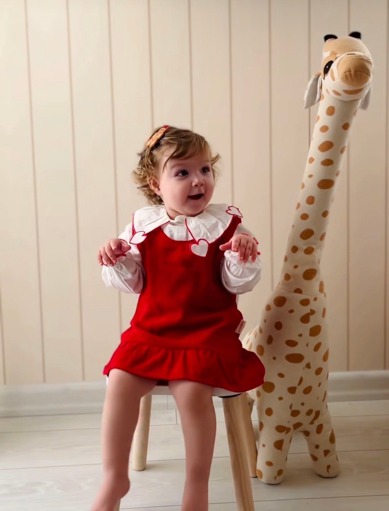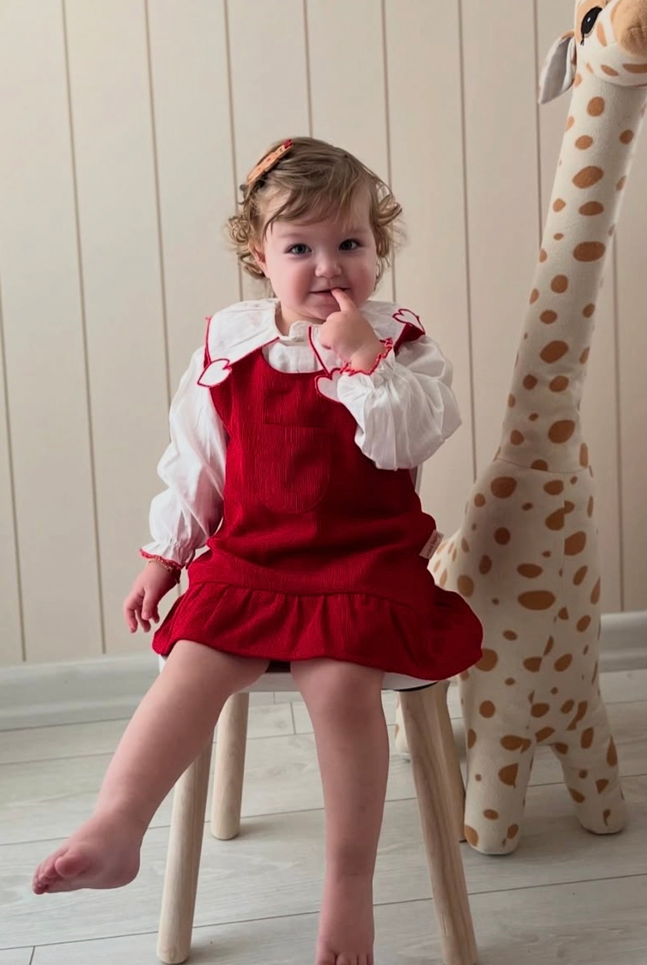 This charming set features a soft white long-sleeve blouse with an exclusive heart-shaped collar detail, paired with a rich red corduroy pinafore dress. Delicate heart accents along the collar add a subtle Valentine’s touch, while the classic silhouette makes it perfect for both special occasions and treasured photos.