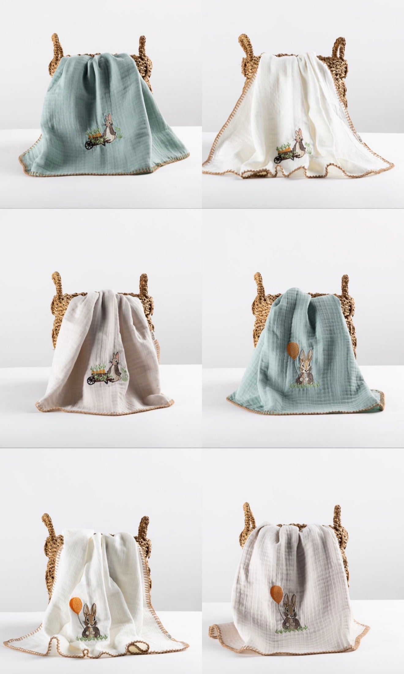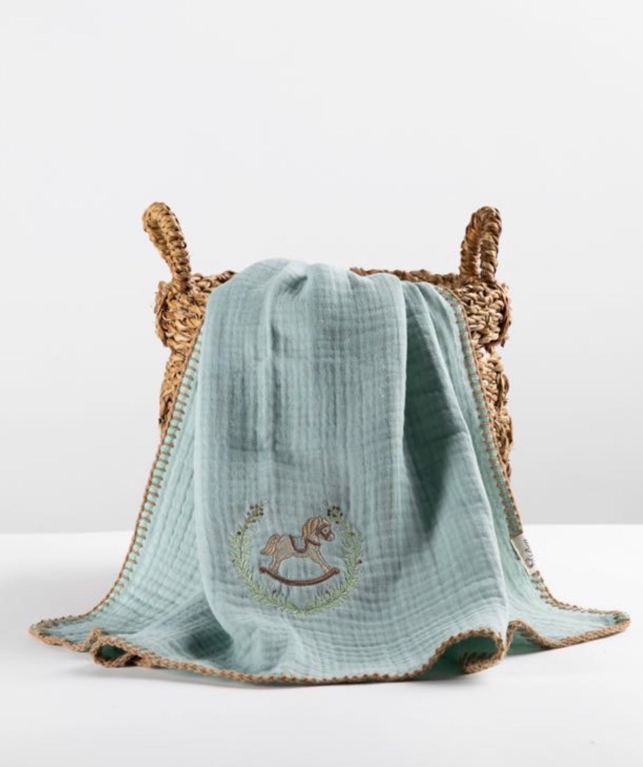 Wrap your little one in pure comfort with this luxurious 4-layer muslin blanket, crafted from 100% cotton for ultimate softness. Measuring 90cm x 80cm, it's the perfect size for strollers, playtime, or cozy cuddles. Each blanket features delicate embroidery and hand-finished edges that showcase thoughtful craftsmanship. Breathable and gentle on sensitive skin, this versatile essential grows with your baby from newborn through toddler years. A timeless gift that's as practical as it is precious.