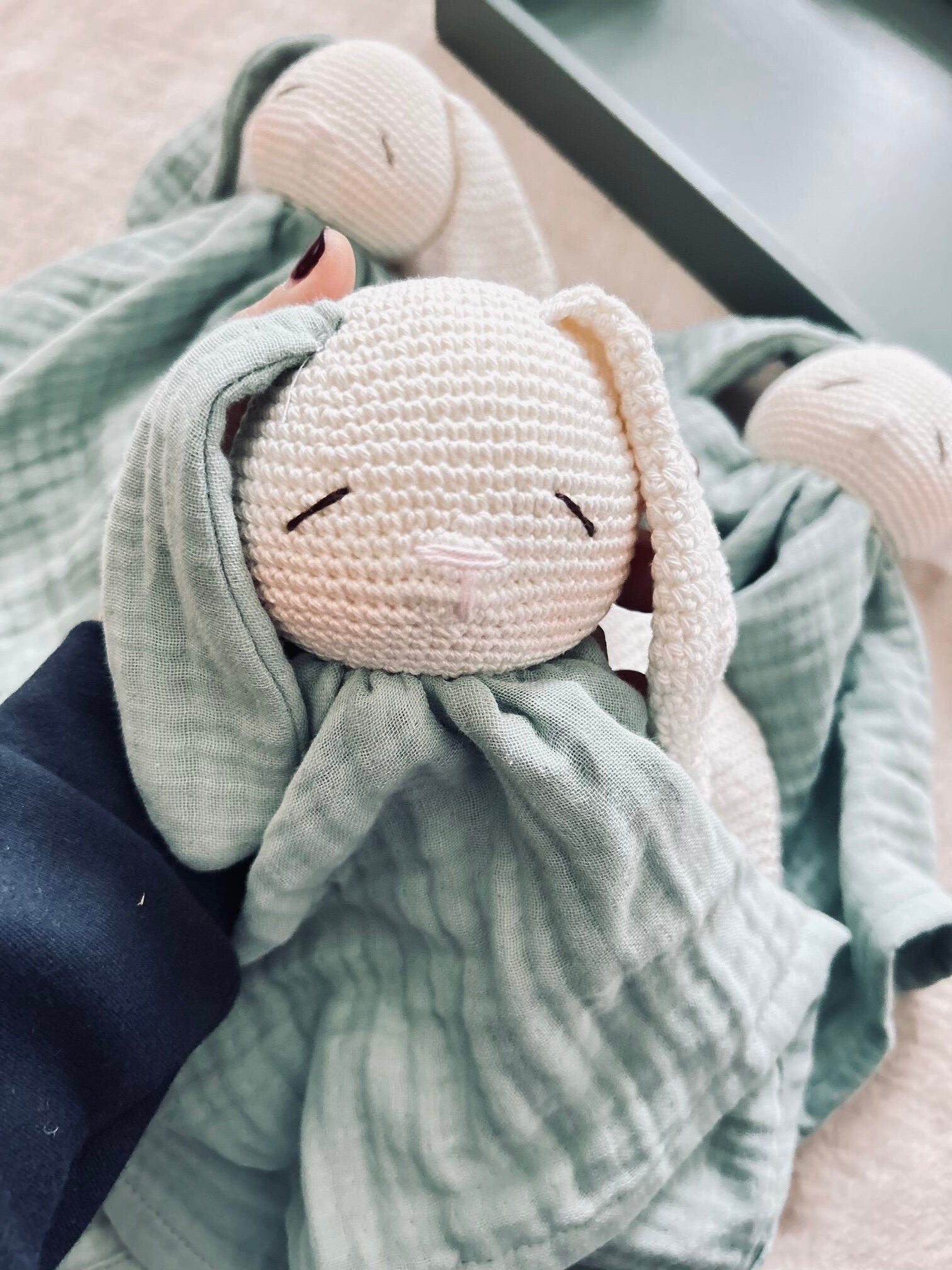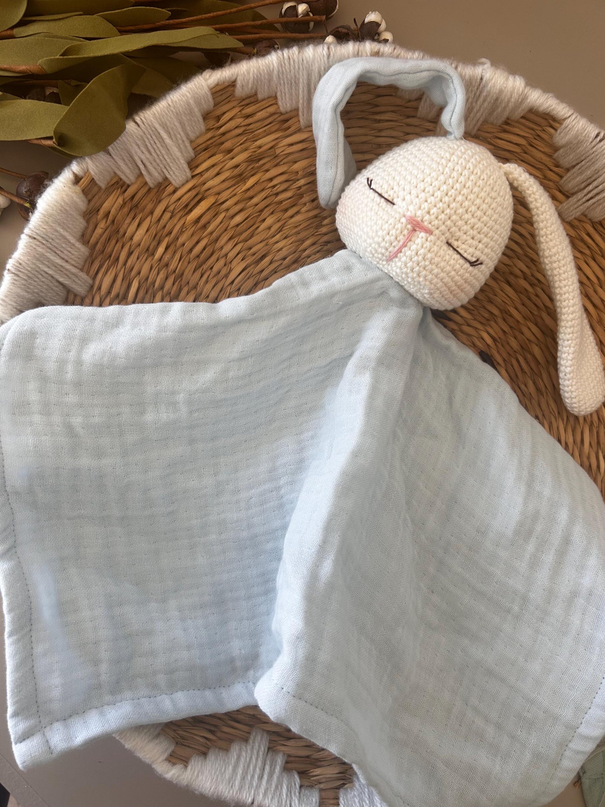 Wrap your little one in comfort with this handmade bunny lovey, featuring a soft, breathable muslin cotton body and a beautifully detailed crochet bunny head, crafted with love and care. This organic security blanket is more than just a cuddly companion—it’s a keepsake designed to be cherished for years.