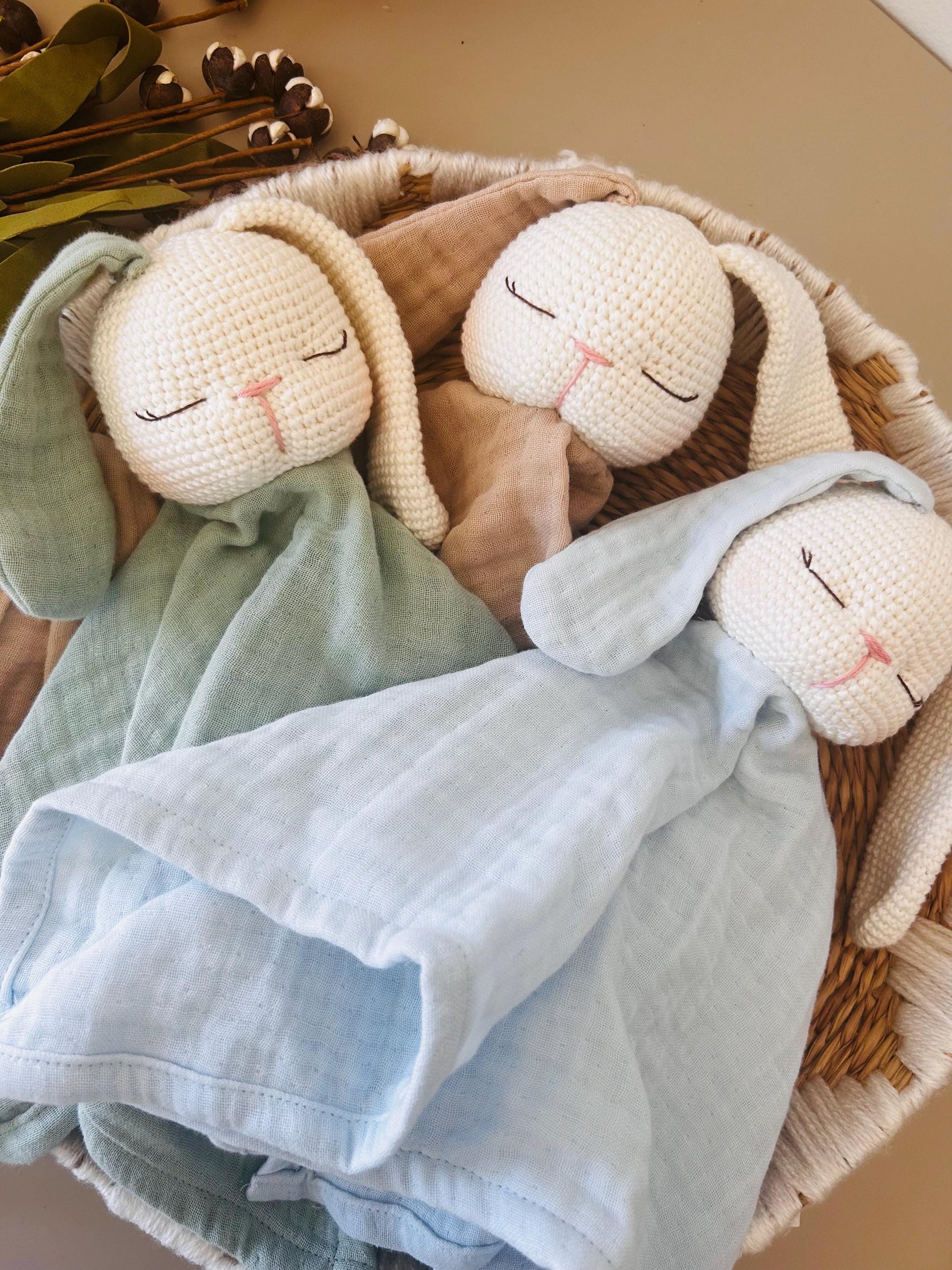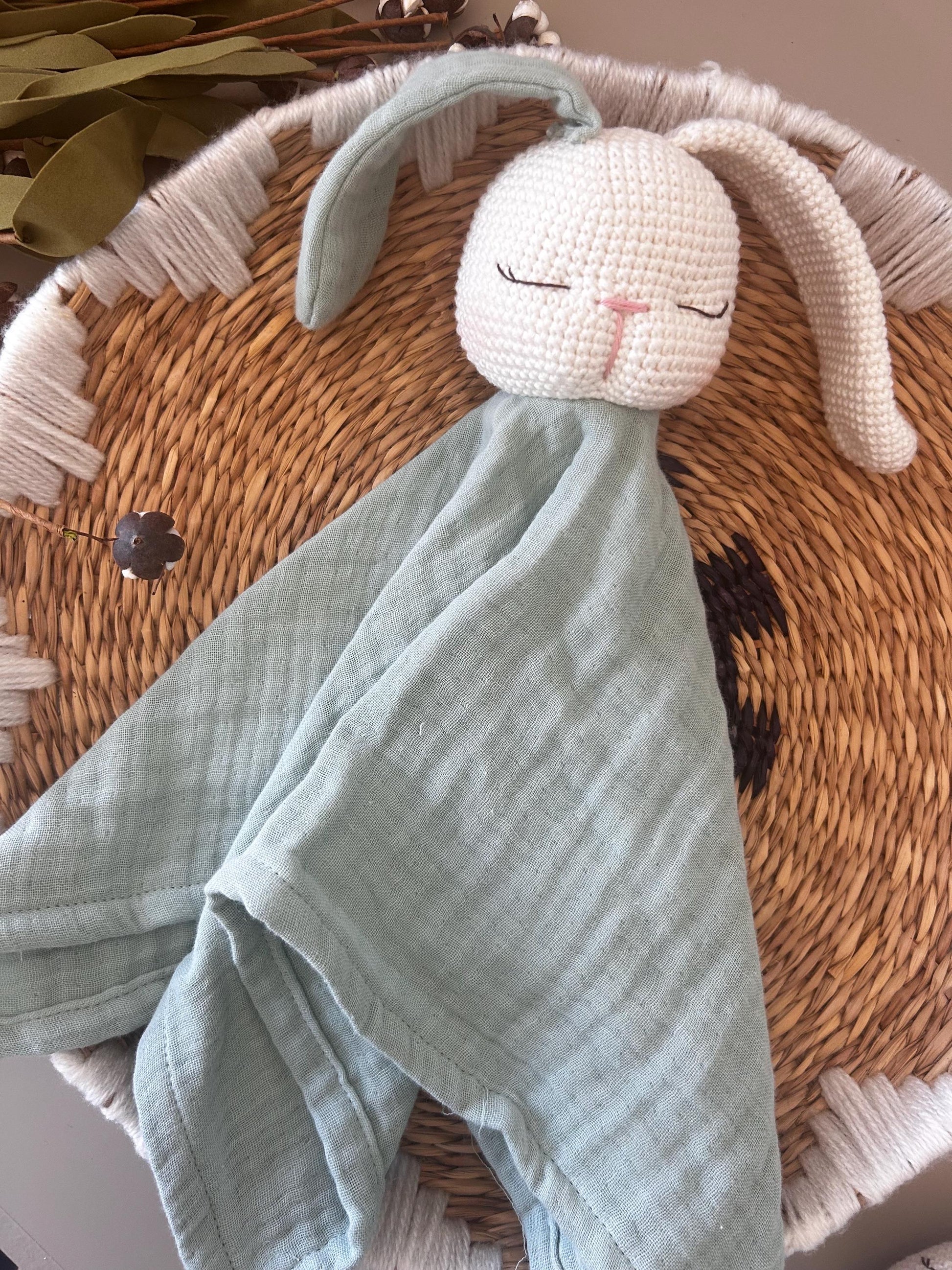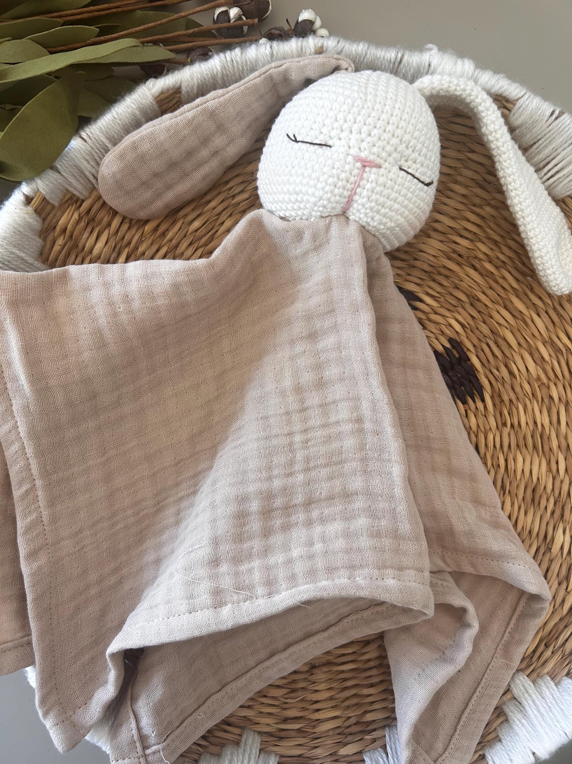 This handmade muslin bunny lovey is a perfect gift for newborns. Featuring an organic cotton muslin blanket and a soft crochet bunny head, it offers comfort, charm, and heirloom quality