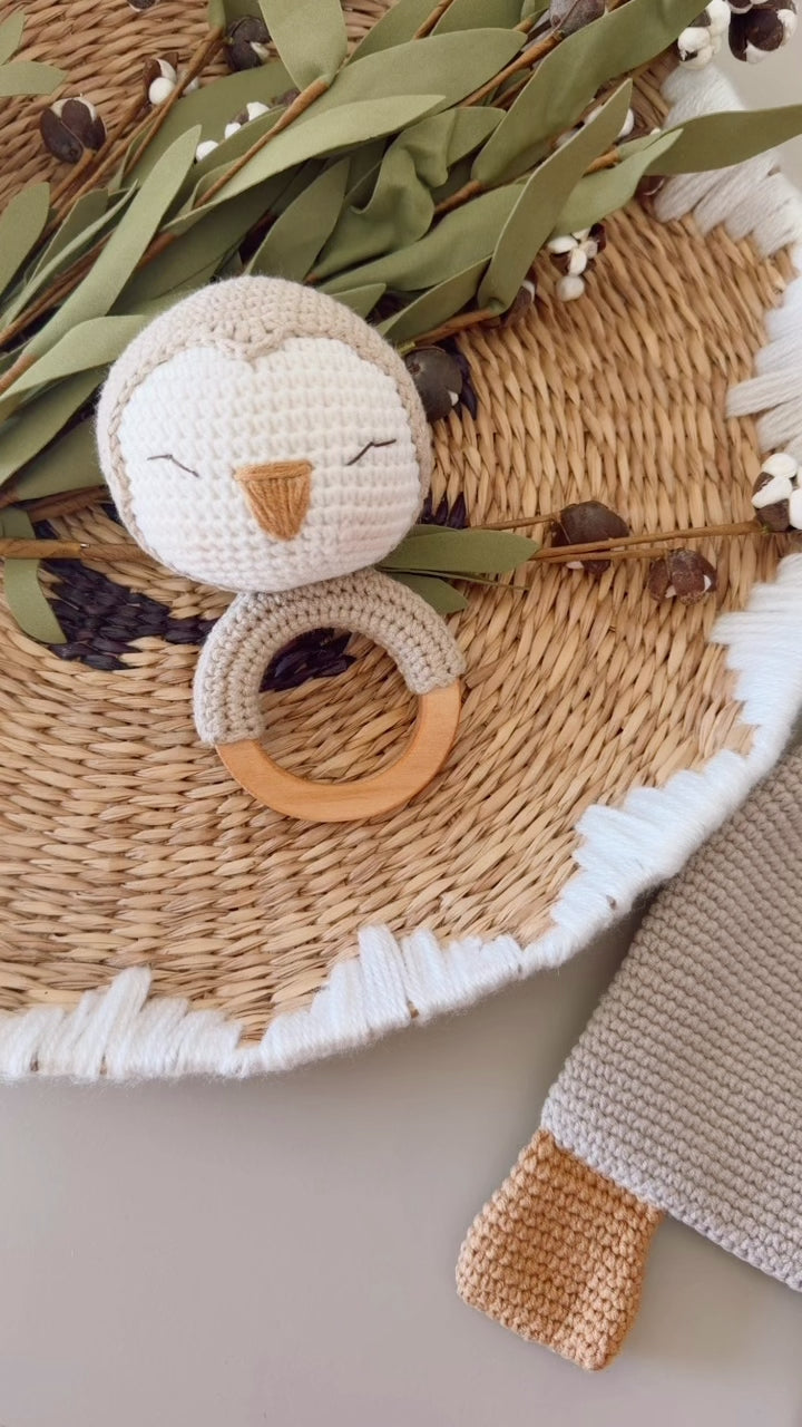 Introduce your little one to comfort and play with this charming 2-piece handmade set! Each lovey is crafted from soft cotton in gender-neutral colors, perfect for snuggling and soothing. The matching rattle features a safe maple wood teething ring and hypoallergenic polyester filling, making it an ideal first toy that grows with your baby. Handmade with care, this keepsake gift celebrates those precious early moments while supporting healthy teething and sensory exploration.