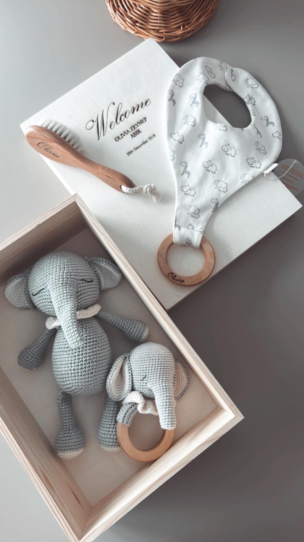 Personalized Baby Gift Box β Elephant Rattle, Amigurumi Elephant Toy, Bib & Baby Brush
