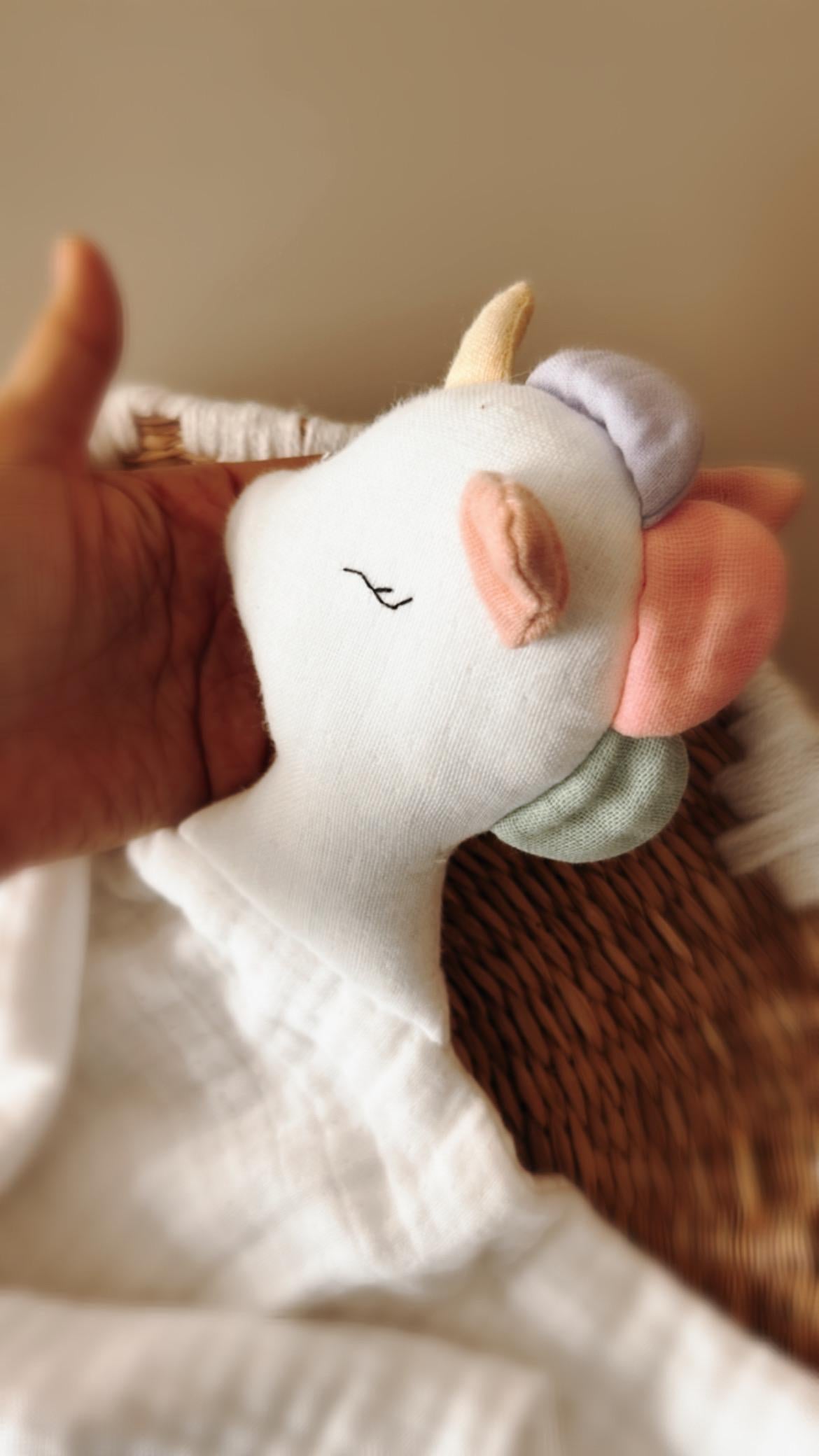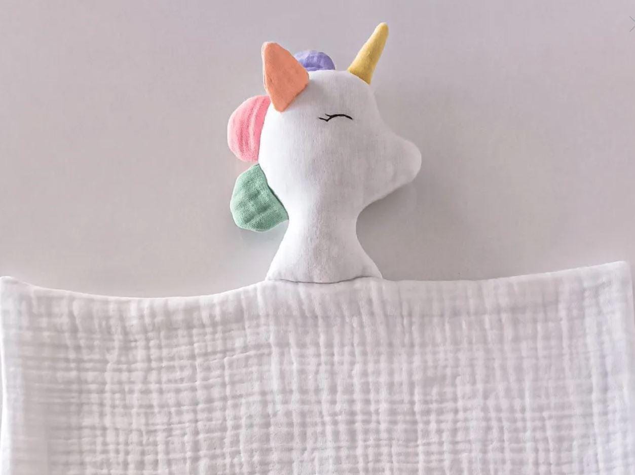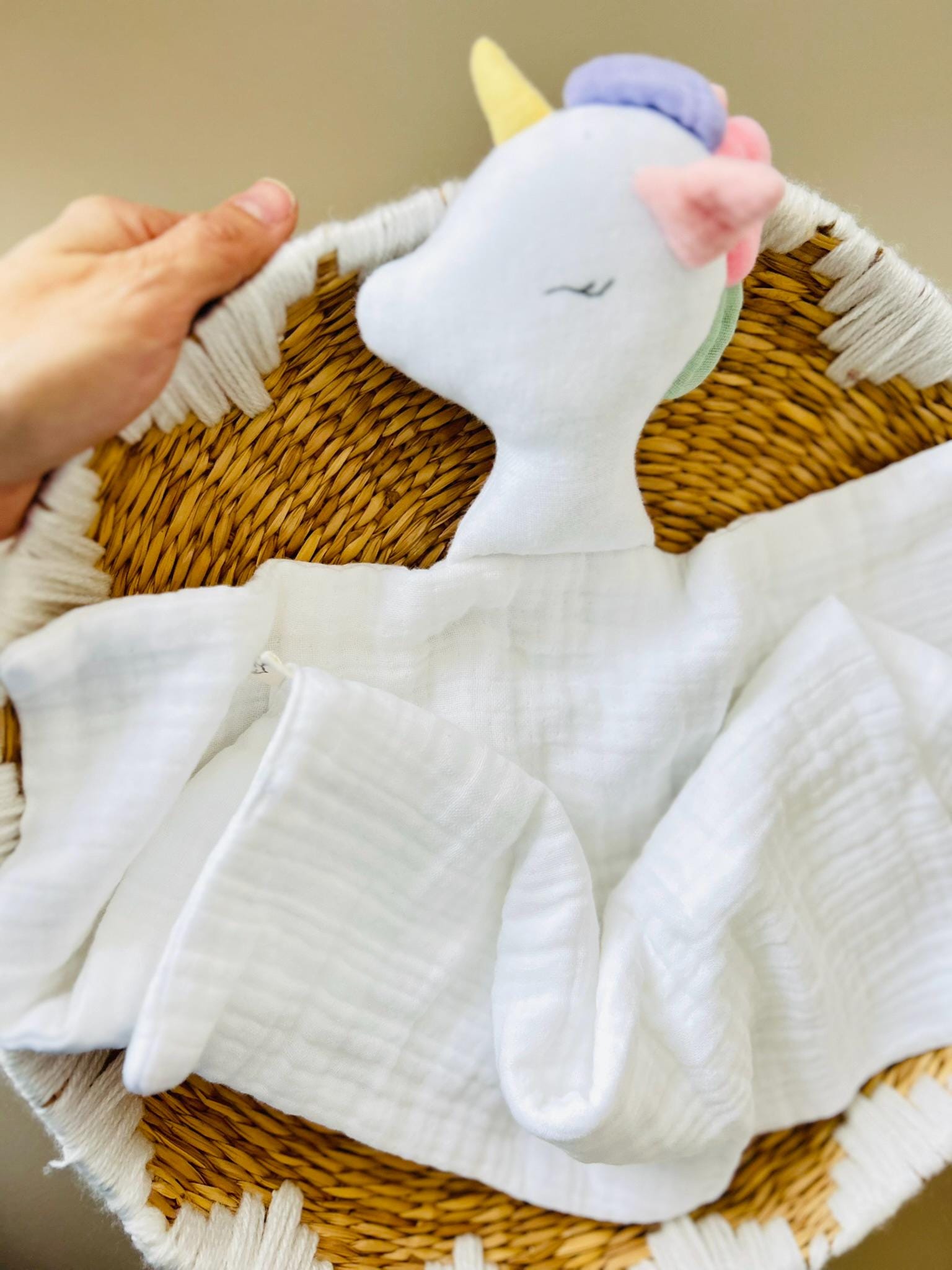 Introducing our enchanting Muslin Baby Lovey Blanket, the perfect combination of comfort and charm for your little one. This delightful lovey features a soft, breathable muslin fabric, ideal for snuggling, and a whimsical hand-crocheted amigurumi character that adds a touch of playful magic. Crafted with love and attention to detail, the unicorn lovey is made from high-quality, non-toxic muslin, ensuring it's safe and gentle against baby's delicate skin. The muslin blanket, known for its lightweight and breathable properties, provides warmth without overheating. Available in a variety of adorable designs and soothing colors, this baby lovey is not only a comforting companion but also a beautiful addition to any nursery. Perfect for cuddles, nap time, and on-the-go adventures, it's a thoughtful gift that both parents and babies will adore.
